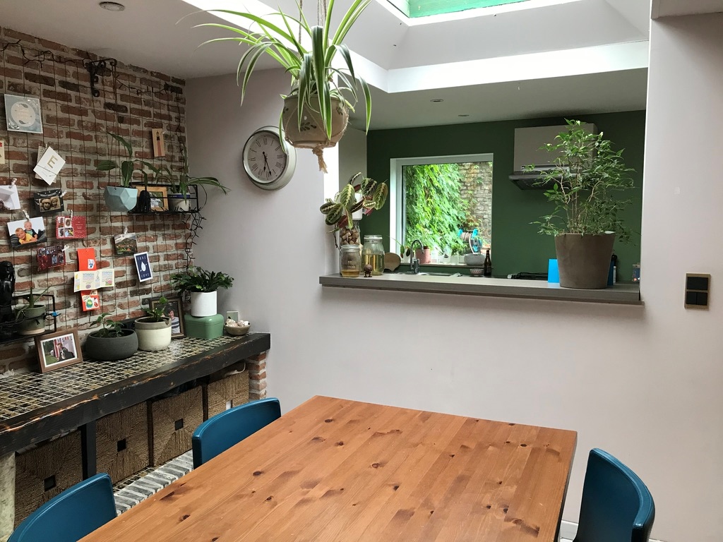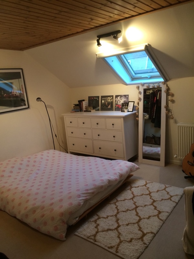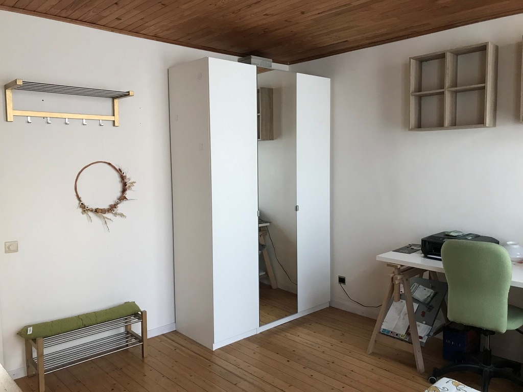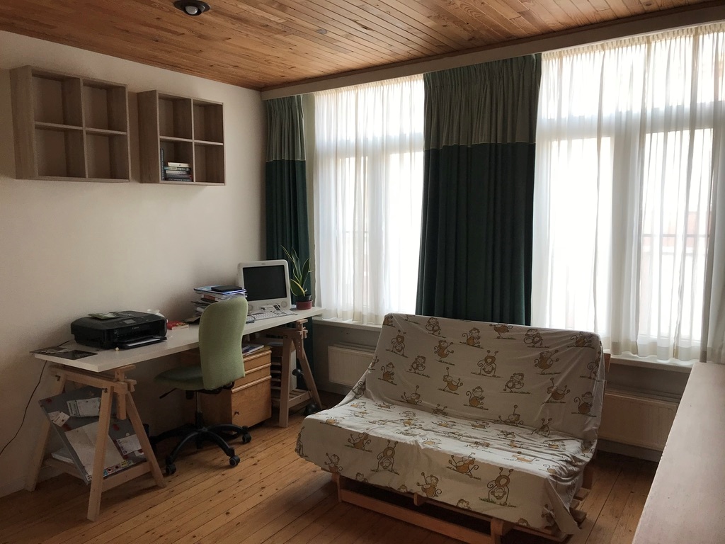 The house is located in the Nekkerspoel neighborhood, close to the city center, train station, shops, and Mechels Broek. On the ground floor, there is a small entrance hall and the open-plan living room and kitchen, which are shared. On the first floor, there is a shared bathroom and one bedroom. This floor also provides access to a sunny roof terrace. On the second floor, there are two more bedrooms. The house is partially furnished.
