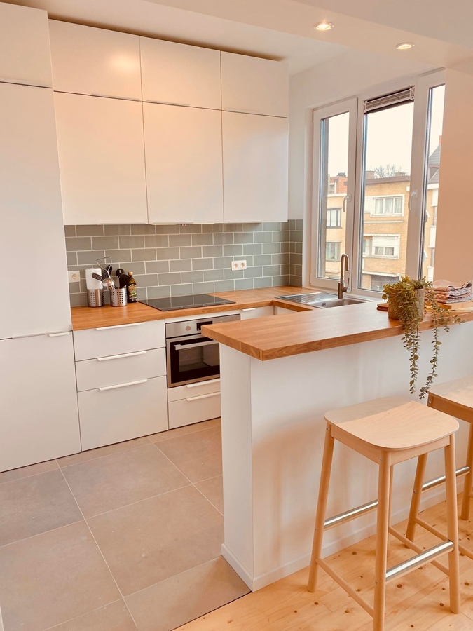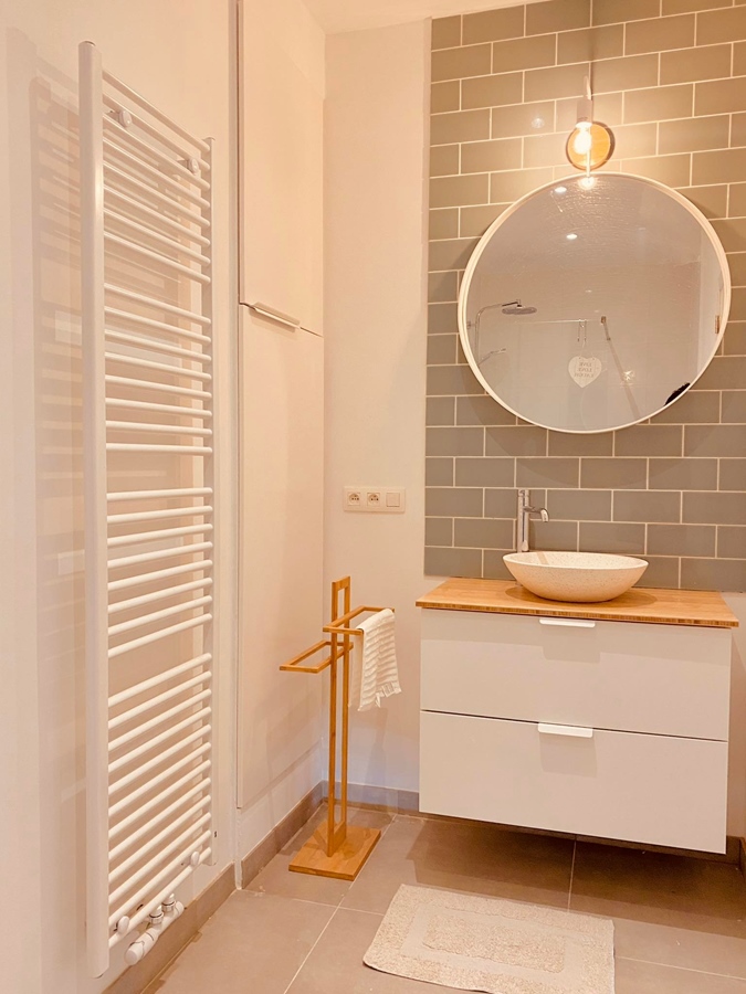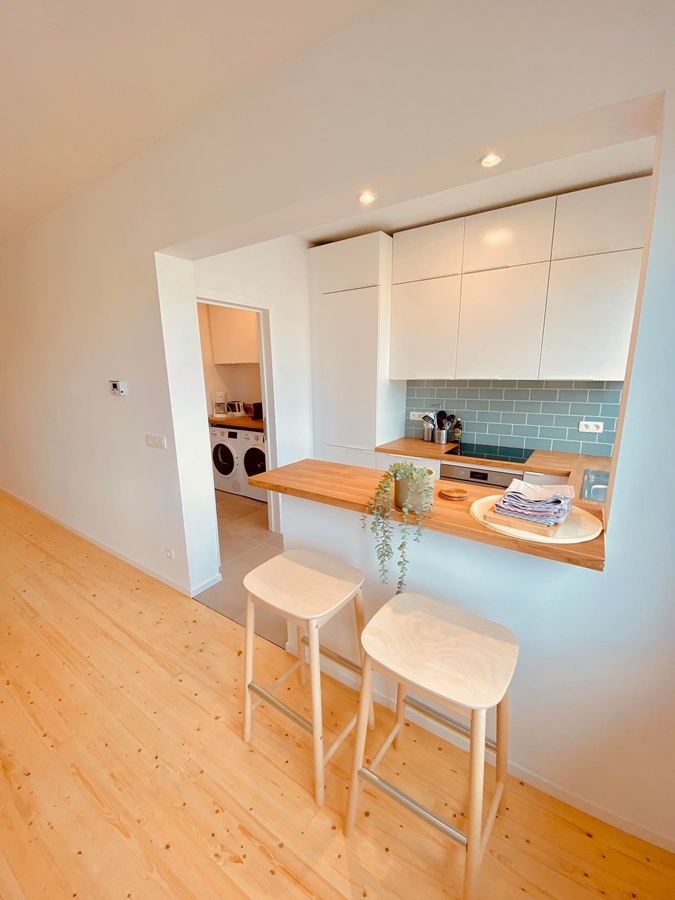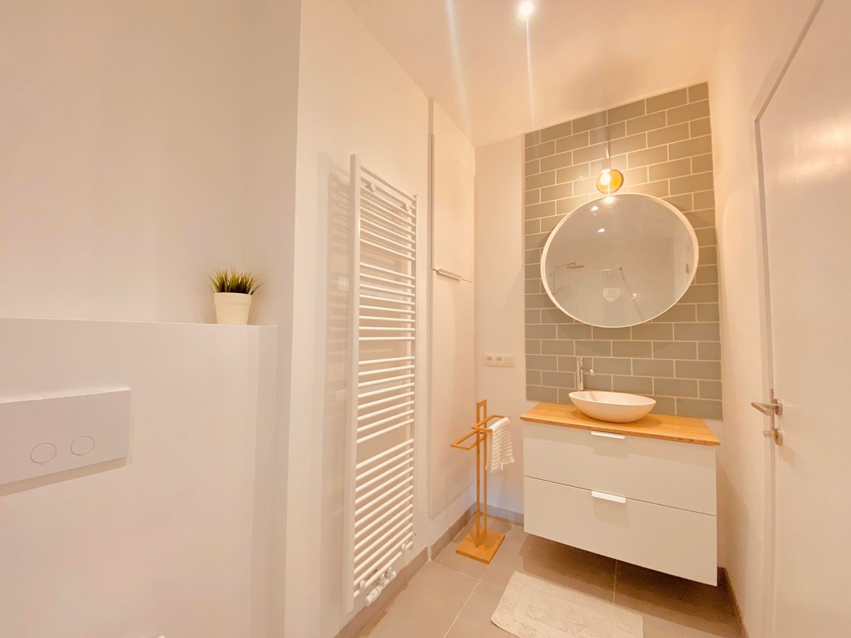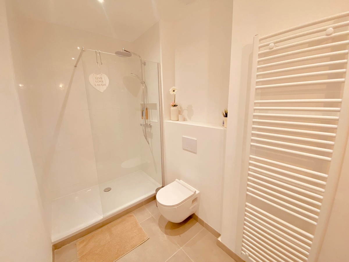 There is a spacious living room with open kitchen and buanderie with storage space, washing machine, dryer, all cleaning materials. There is a sunny terrace. The bathroom has a spacious shower, toilet, sink.