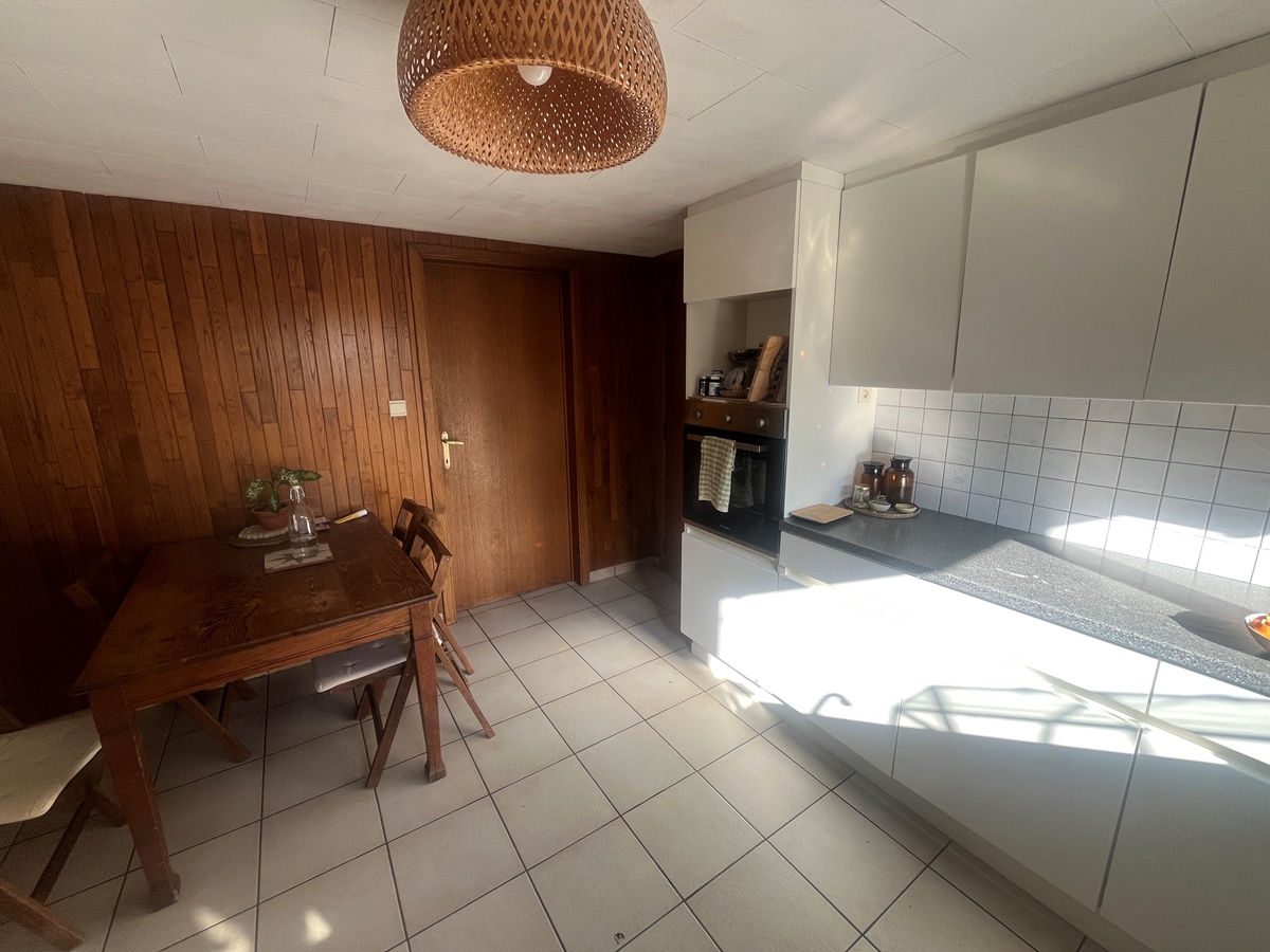 The house features a kitchen with an oven and stove, a storage room with a fridge and storage space, a laundry room where a washing machine and the boiler are located, and a small bathroom with a shower, toilet, and sink. Furthermore, there is a cozy, spacious living area with a seating area and a large table.