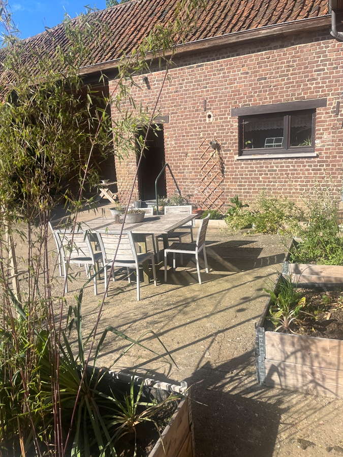 There is a large but cozy courtyard, where it gets nice and warm when the sun shines. Here, there are raised beds for vegetables and a garden table with chairs.