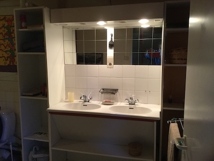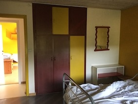 Au rez-de-chaussée : un couloir avec toilettes, une grande cuisine avec îlot central, un coin repas, un couloir et un spacieux séjour avec poêle et douche séparée. À l’étage : une salle de bains avec toilettes et trois chambres. L’appartement est meublé simplement, avec de nombreux placards intégrés dans la cuisine et les chambres, un lit double, plusieurs armoires et une table. Il est également possible d’utiliser les placards de rangement extérieurs.