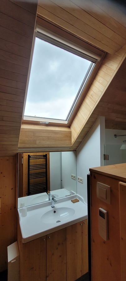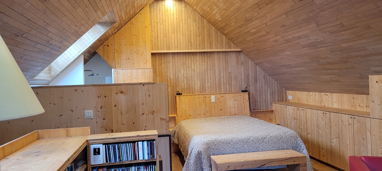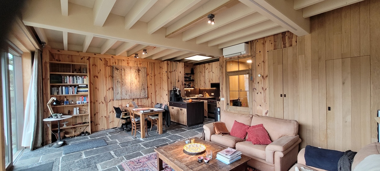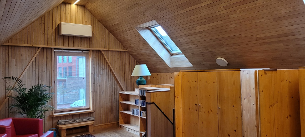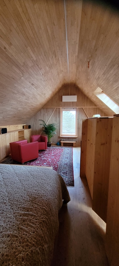 The upper part of a timber frame construction with a view of the garden and green roof. completely renovated rear house in timber frame construction. Ecological materials. beautiful garden. It is a part that will become a Cohousing project in the future. The entire front house is completely renovated. The rear house is located 30 m from the street and is very quiet..