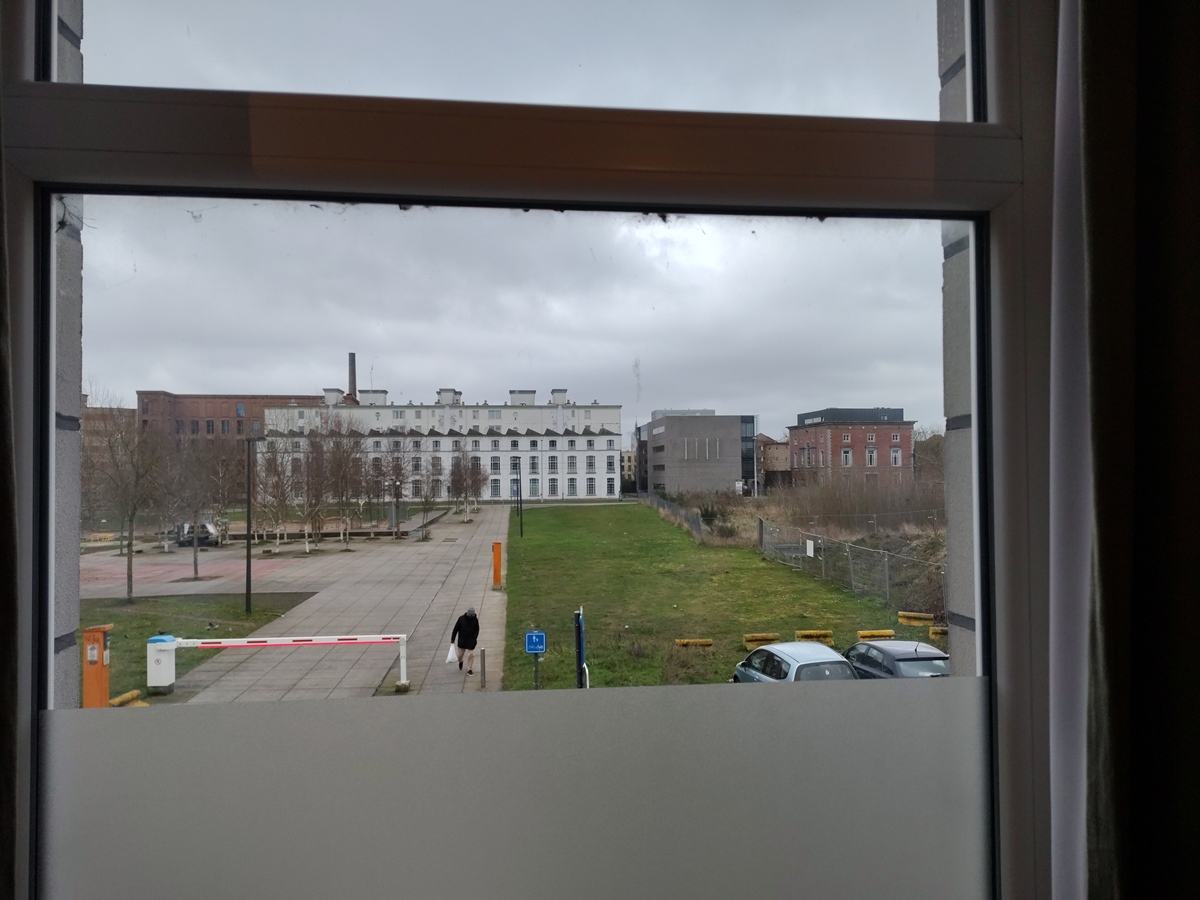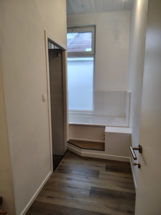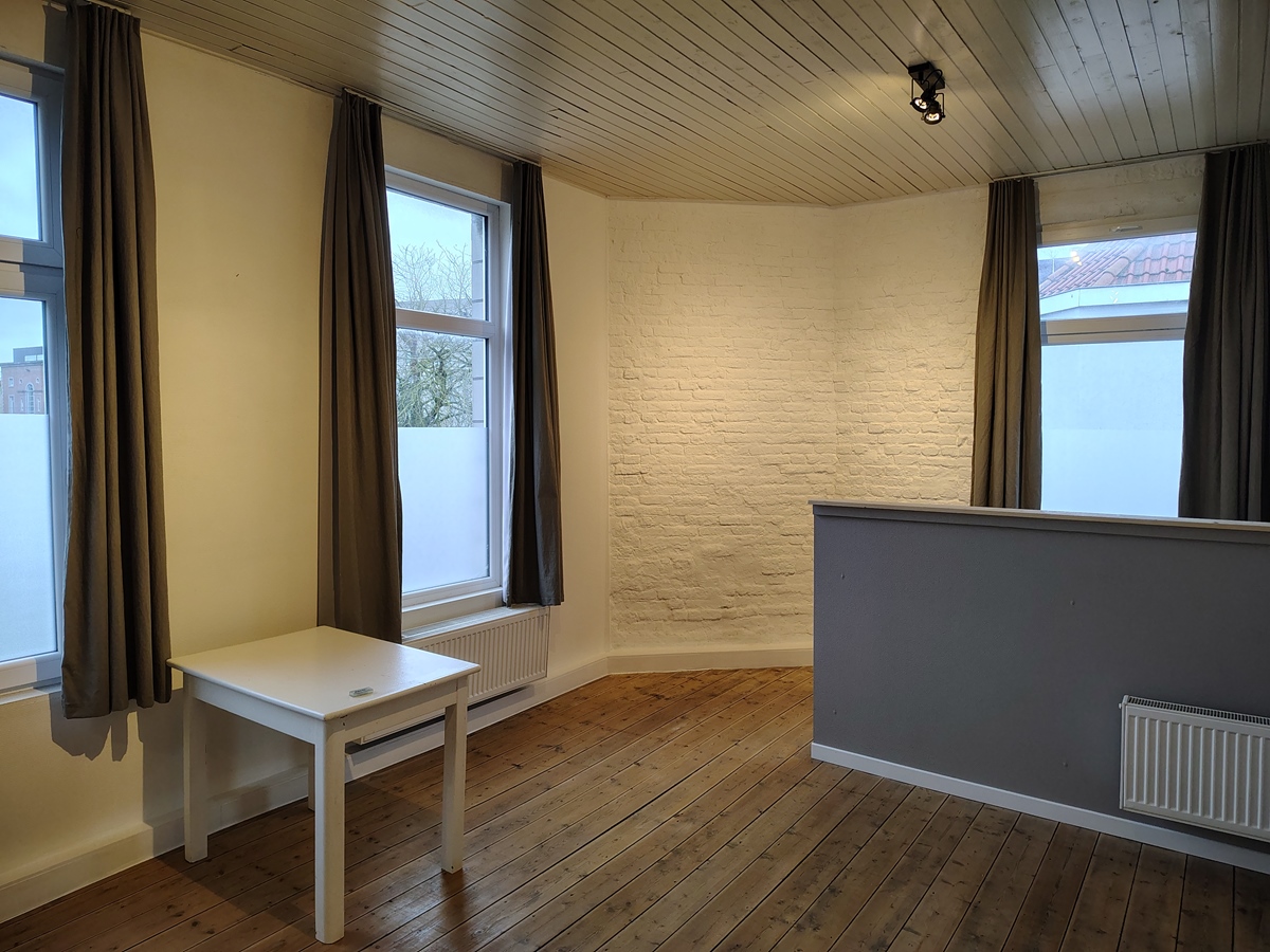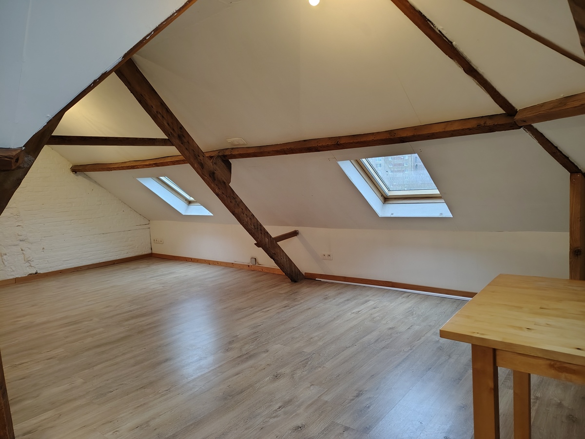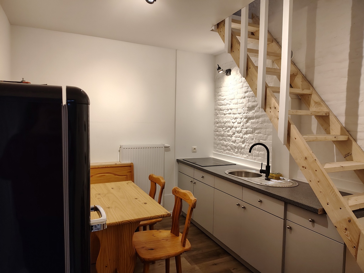 Une cuisine avec coin repas, un petit salon, une petite terrasse sur le toit, un couloir pour les vélos et une cave.