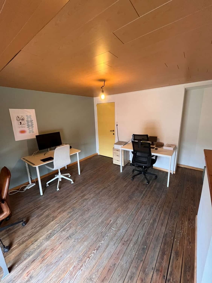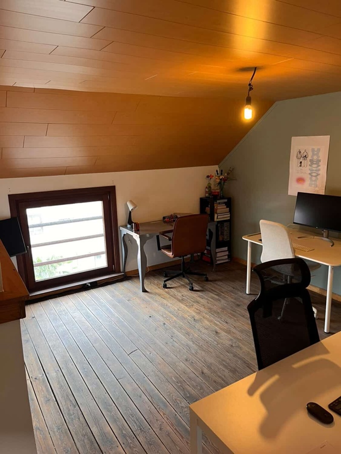 Chambre privée et confortable au deuxième étage, baignée de lumière et suffisamment spacieuse pour accueillir un lit, un bureau et une armoire. Endroit calme, idéal pour un moment de détente.