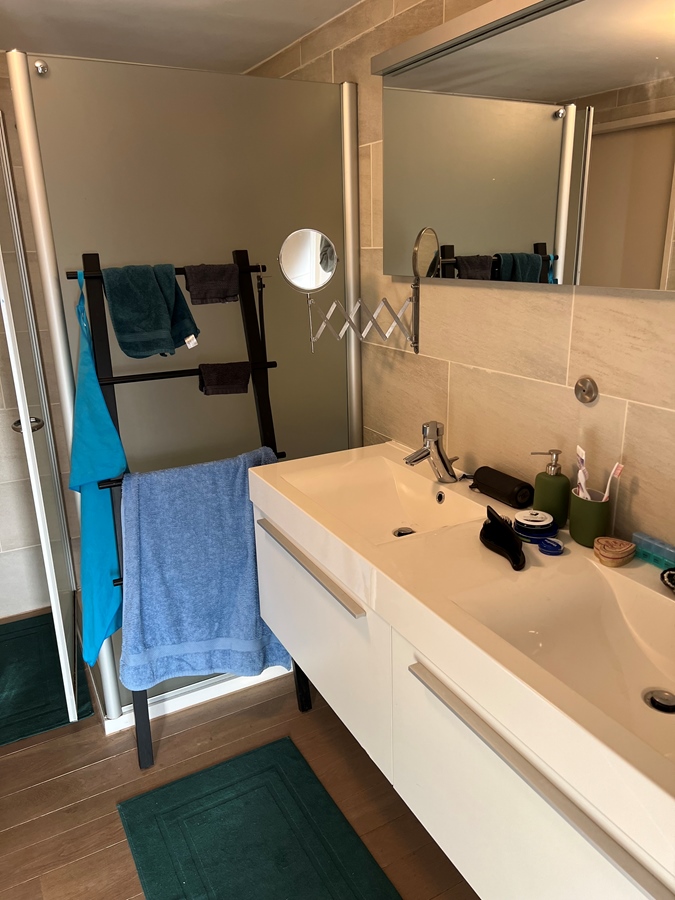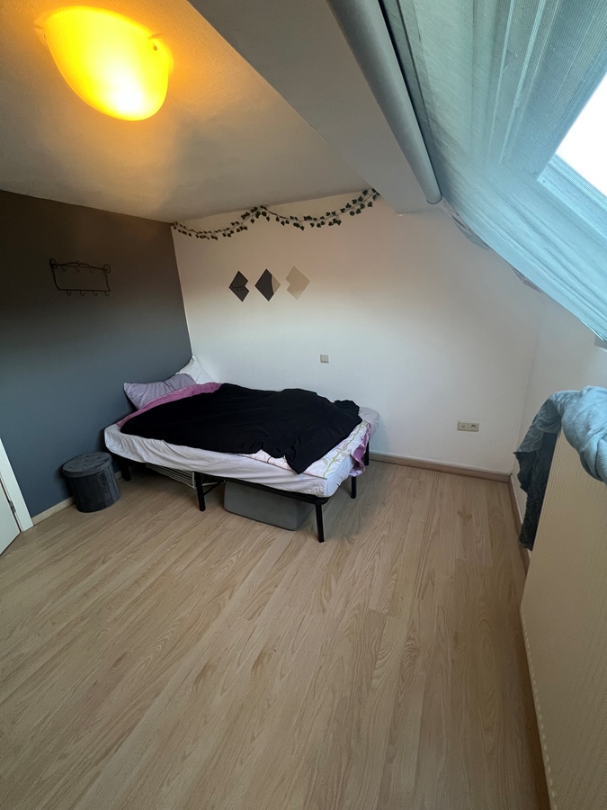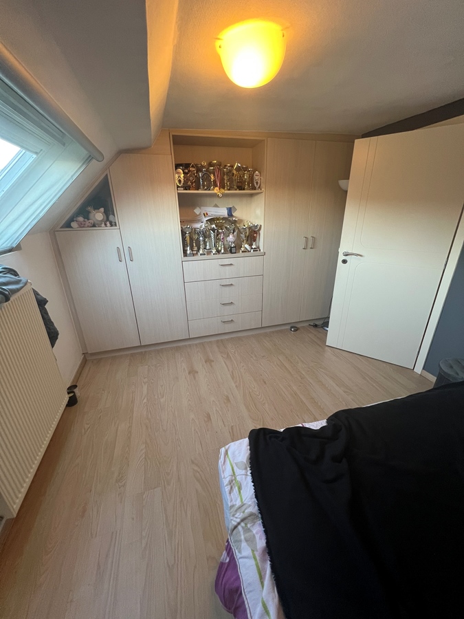 Il y a deux chambres à l'étage ; la chambre libre est petite mais confortable et offre de nombreux rangements. Un lit y est déjà installé, mais on peut la vider complètement.