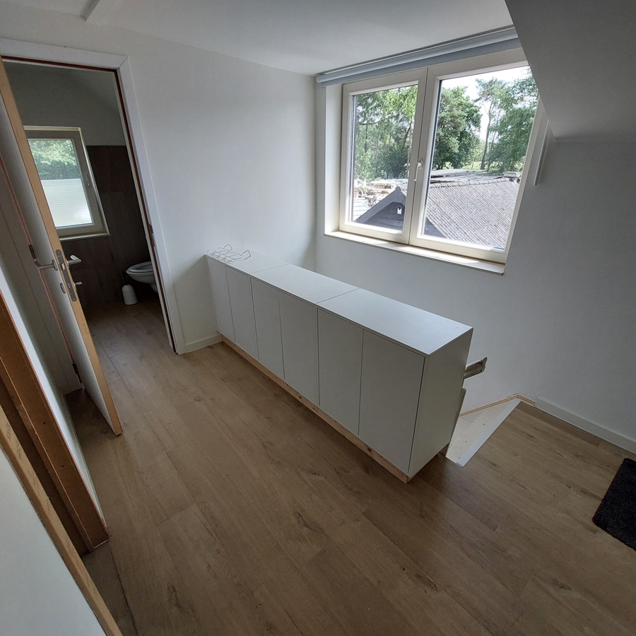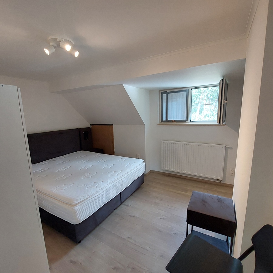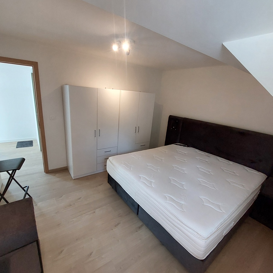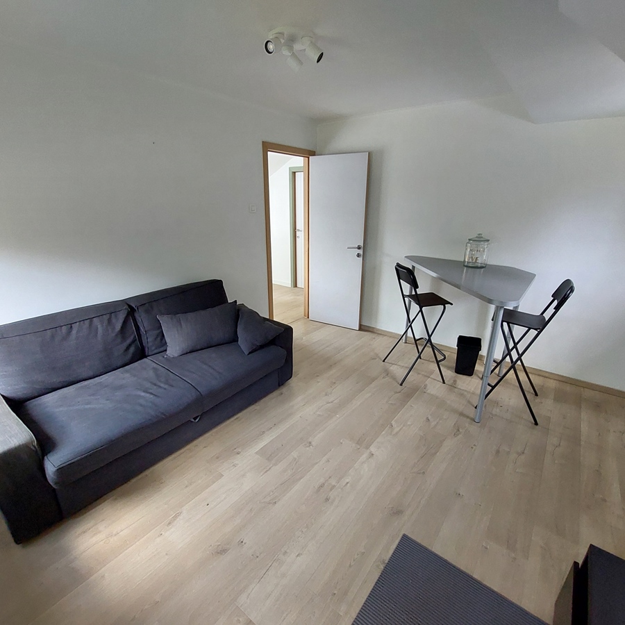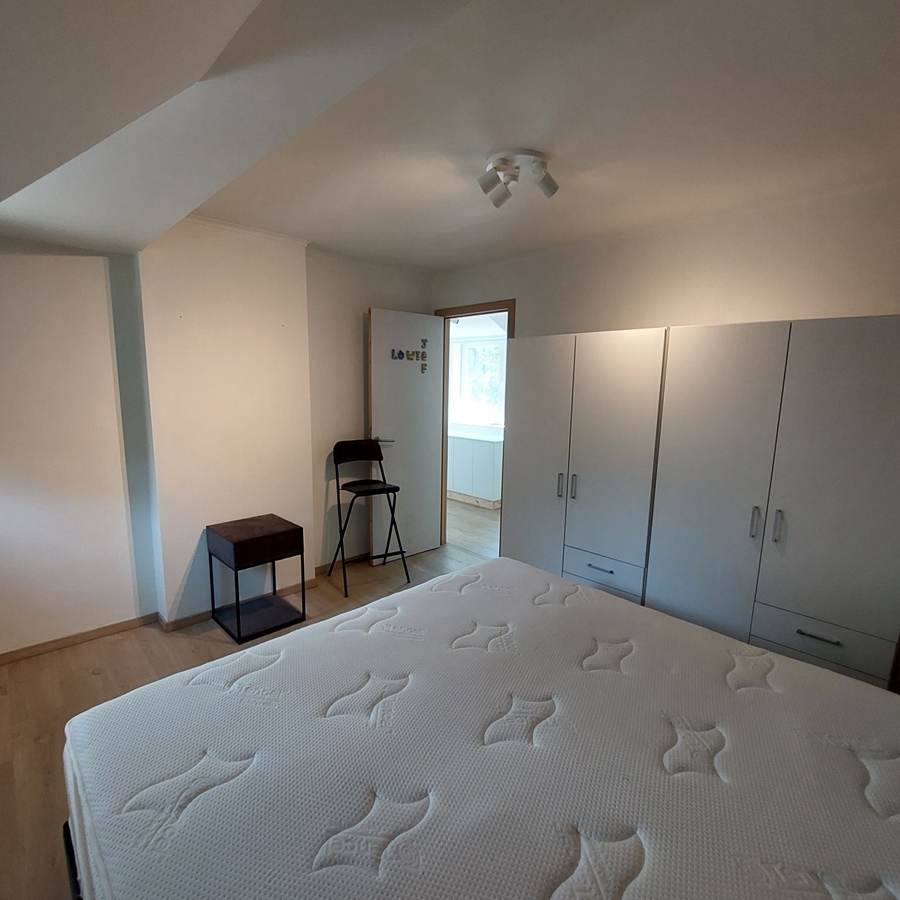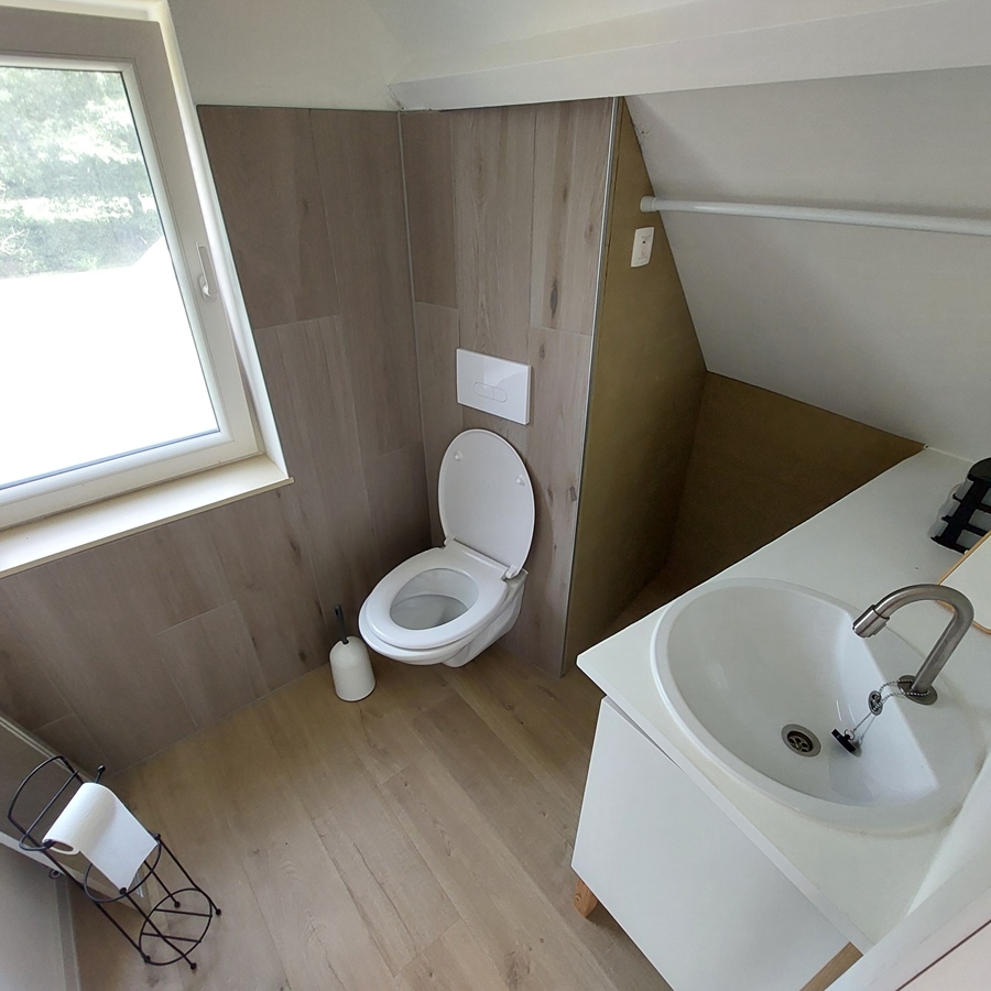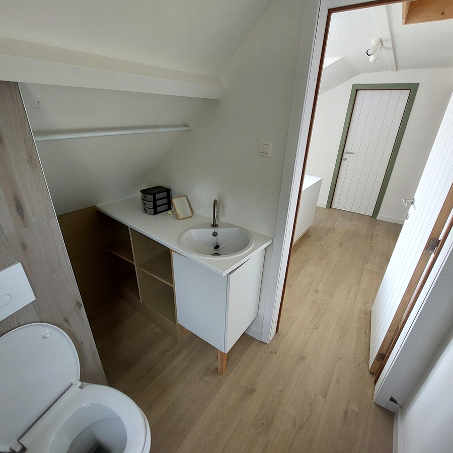 L'étage supérieur, d'une superficie de 30 m², est entièrement réservé au colocataire. Il comprend un placard, un canapé-lit, une table avec tabourets, un lit et des toilettes avec lavabo.