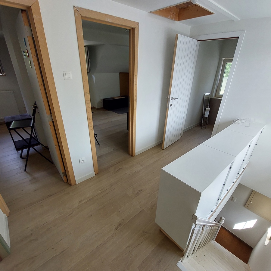 Le dernier étage, d'une superficie de 30 m², comprend deux pièces, des toilettes et un dégagement avec placards. Le rez-de-chaussée, d'une superficie de 100 m², abrite tous les espaces communs : une salle de bain avec douche, des toilettes, une buanderie, une chaufferie/séchoir, un grand débarras et un spacieux séjour avec cuisine. Un jardin entièrement clos à rénover et une terrasse complètent ce bien. Situé entre champs et bois.