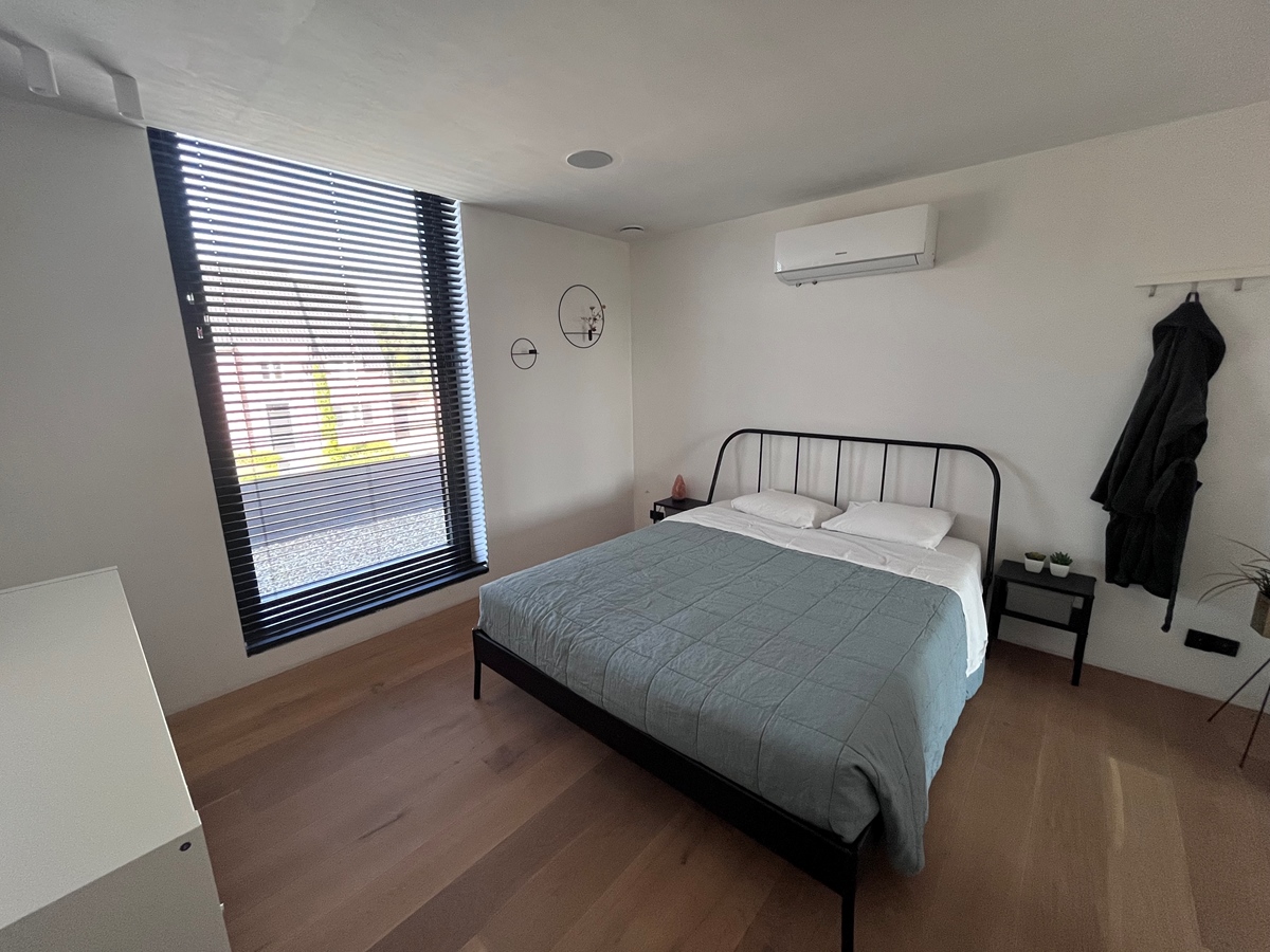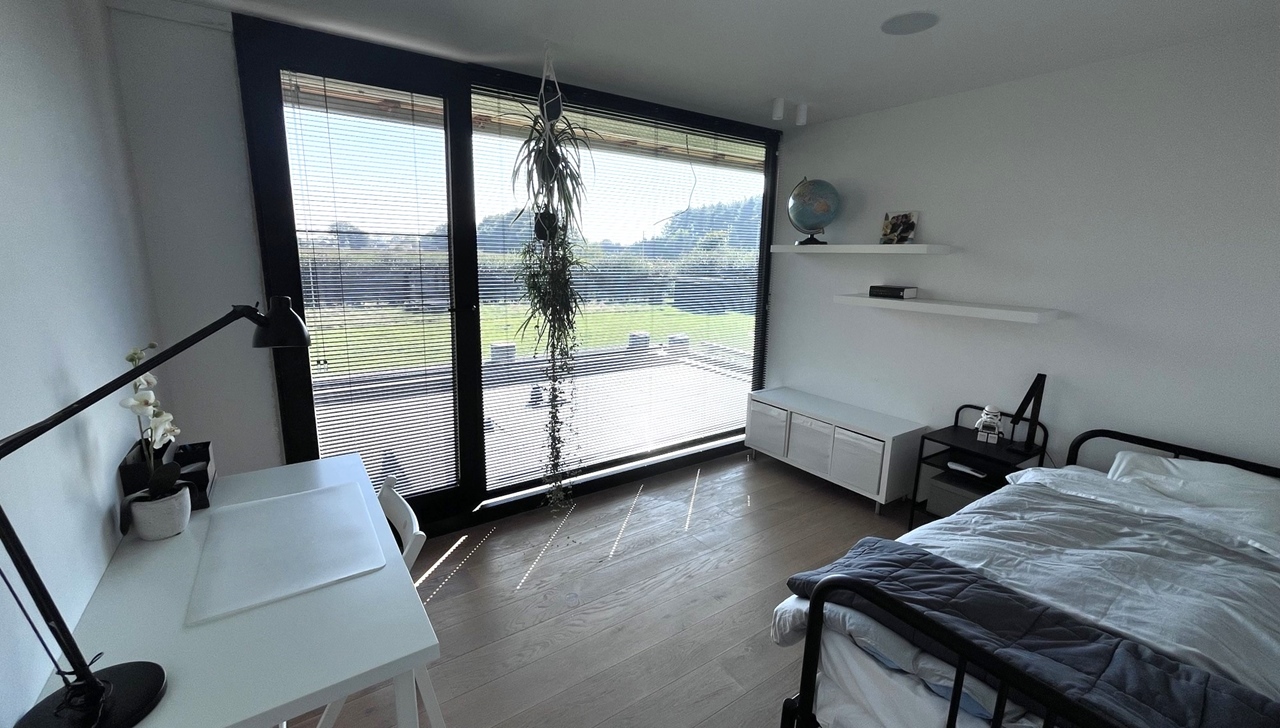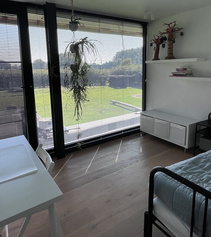 Chambre meublée de 13 m² avec climatisation et parquet. Elle comprend un lavabo, une armoire, un bureau et plus encore. Une grande fenêtre avec stores occultants est orientée ouest. Outre cette chambre privée, la maison est suffisamment spacieuse pour offrir un refuge paisible.