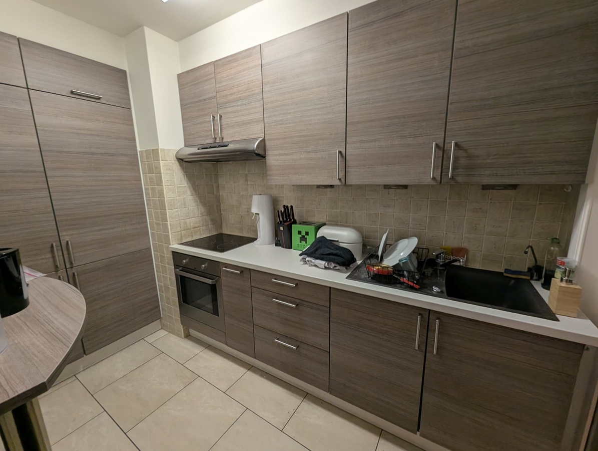 and sofa. The kitchen is fully equipped with a fridge, freezer,