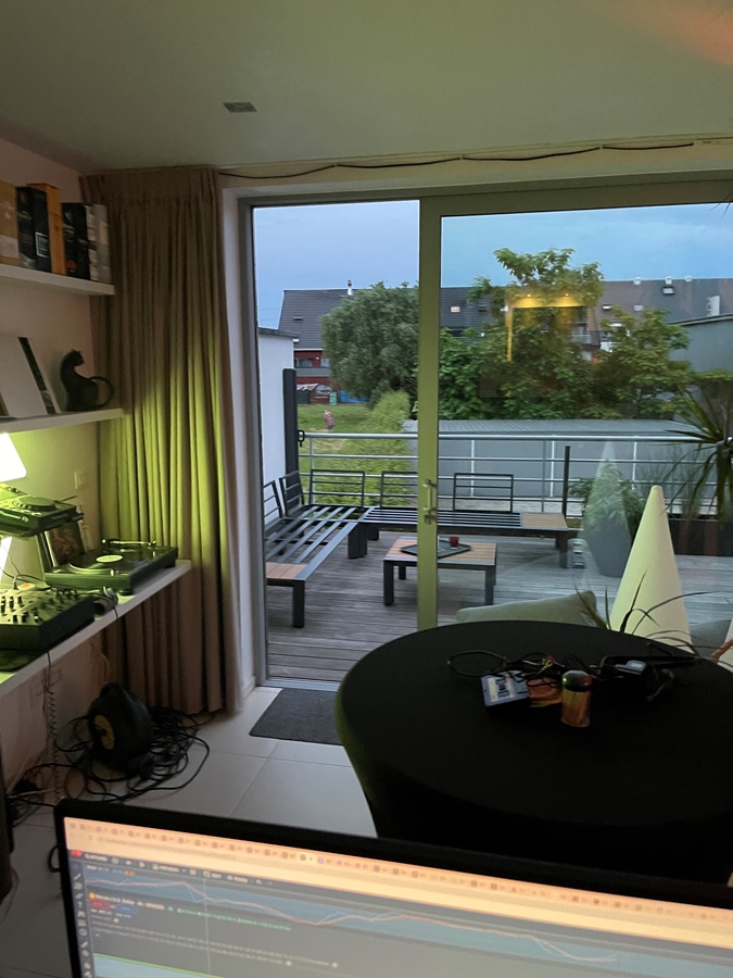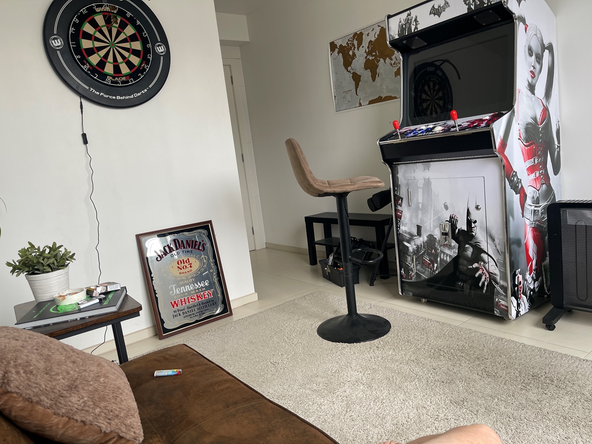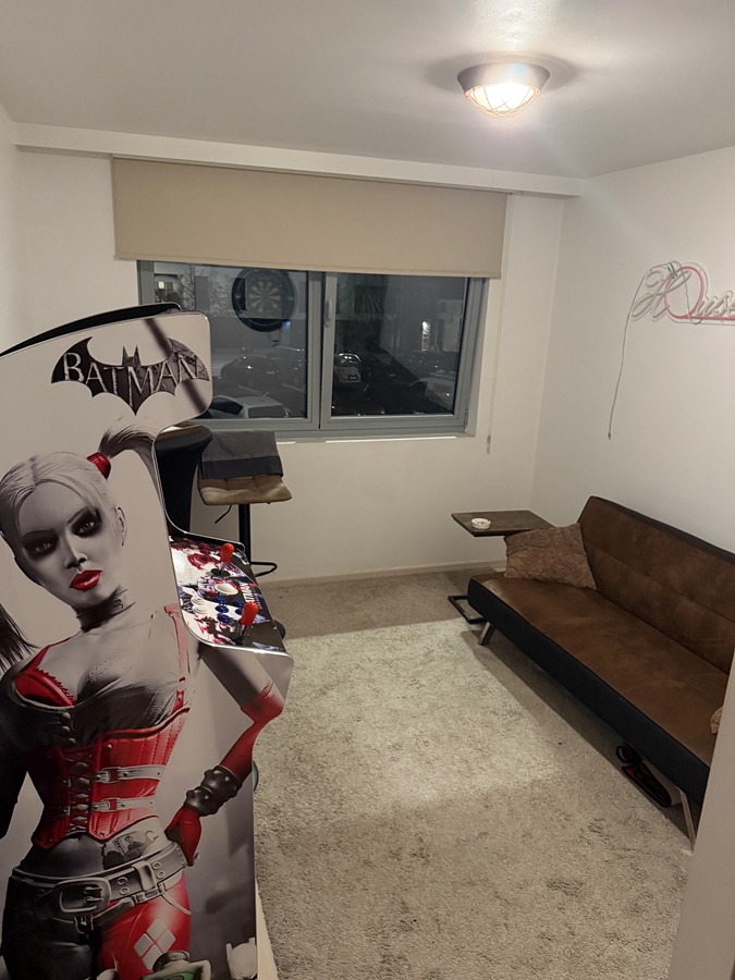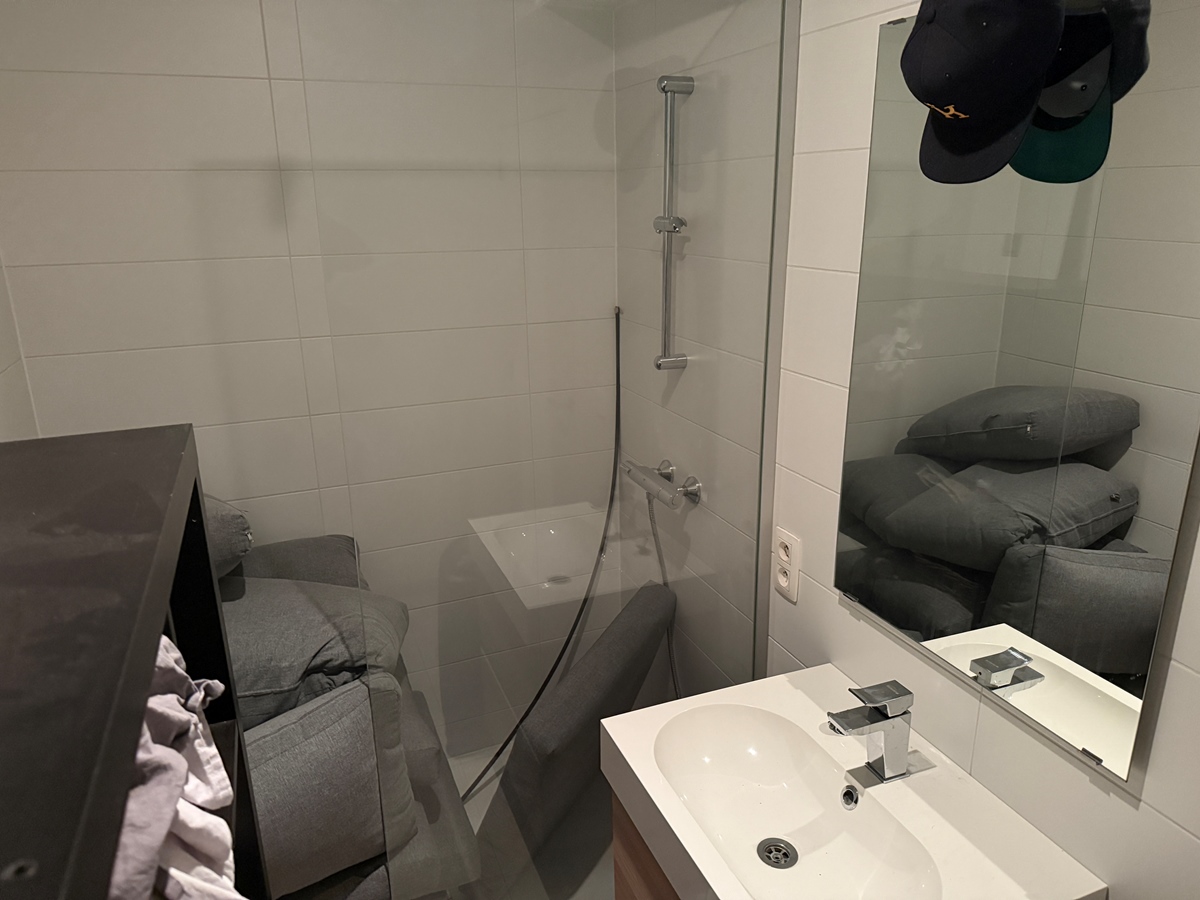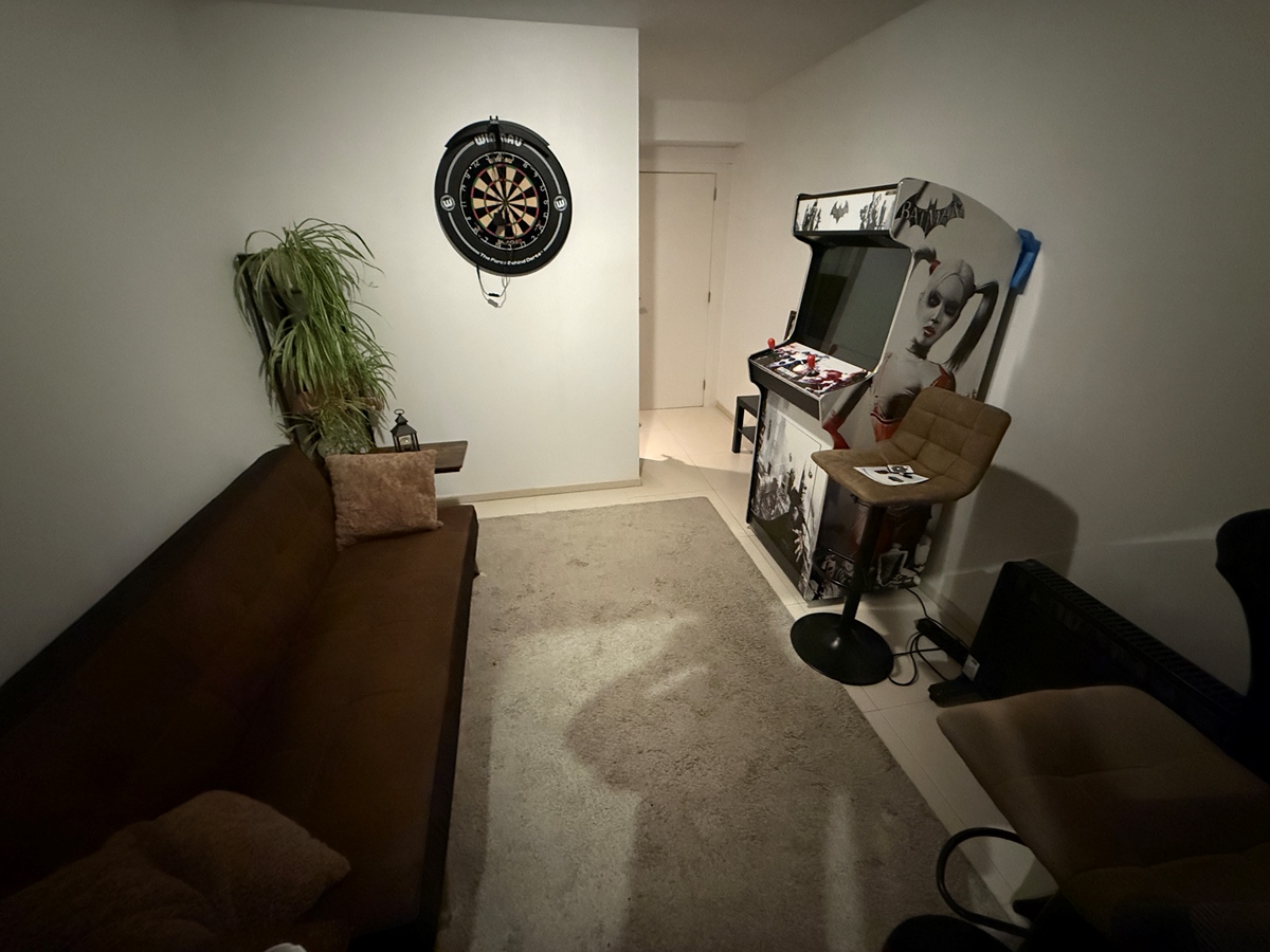 Chambre avec petite salle de bain attenante et douche à l'italienne (16 m²). Face à la chambre, dans le couloir, se trouve une spacieuse armoire encastrée. Des connexions internet et câble sont également disponibles. L'espace privé est actuellement photographié avec un jeu de fléchettes et une borne d'arcade, mais cette pièce sera bientôt vide.