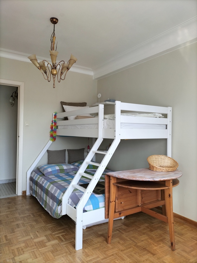 La chambre dispose d'un lit superposé, en dessous de 1,40 m sur 2 m et au-dessus de 0,90 m sur 2 m, et est en plus agréable et pratique.