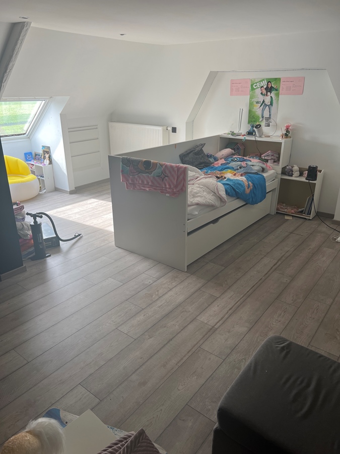 Pièce mansardée spacieuse et rénovée, avec plafonds mansardés et fenêtres Velux. Exposition sud-ouest.