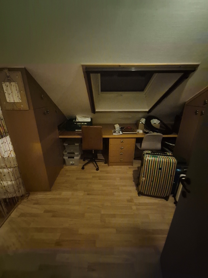 Une chambre en mezzanine est disponible, équipée d'un lit simple, d'un grand bureau et de placards. Il y a également une pièce séparée avec un canapé et une télévision.
