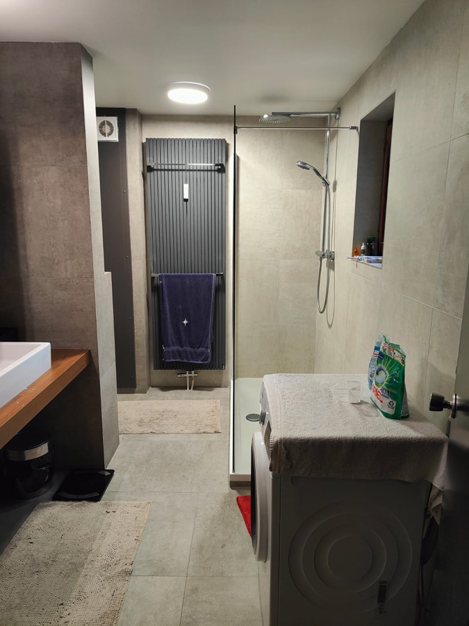 La plus petite salle de douche dispose de toilettes et offre tout le confort dont vous avez besoin. Pour les sportifs, il y a un rameur, une kettlebell de 18 kg, des haltères et un développé couché avec pour l'instant 50 kg de poids.