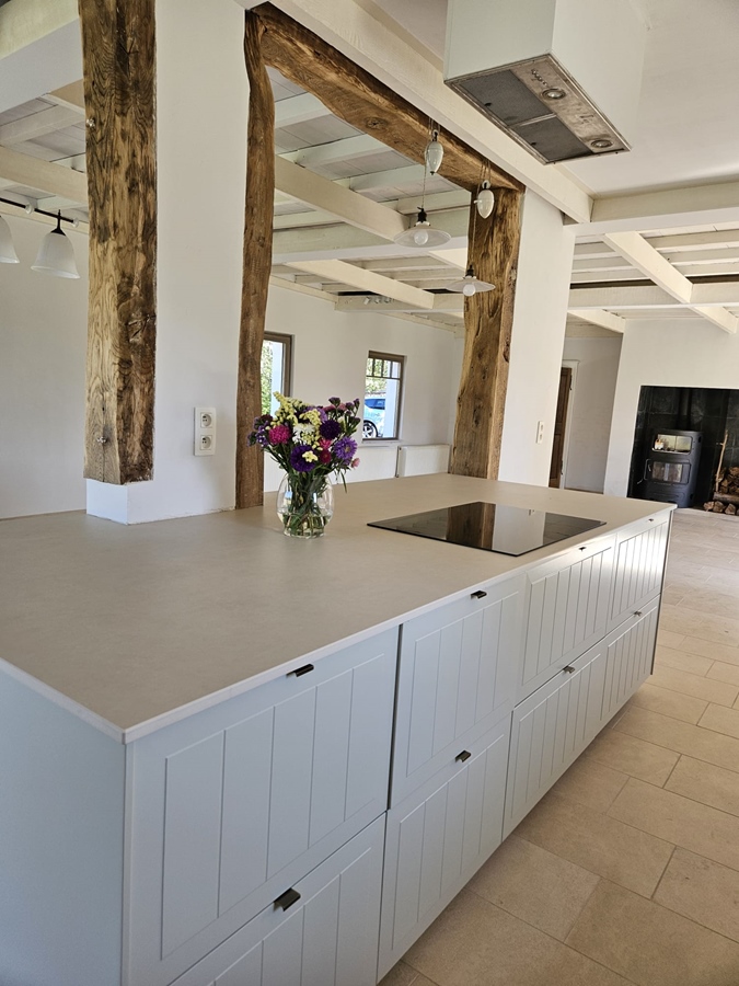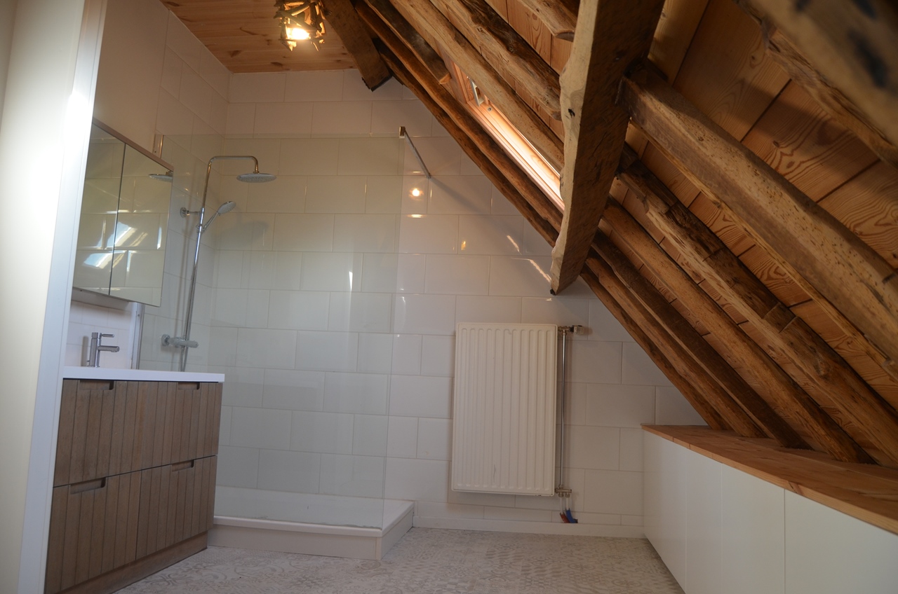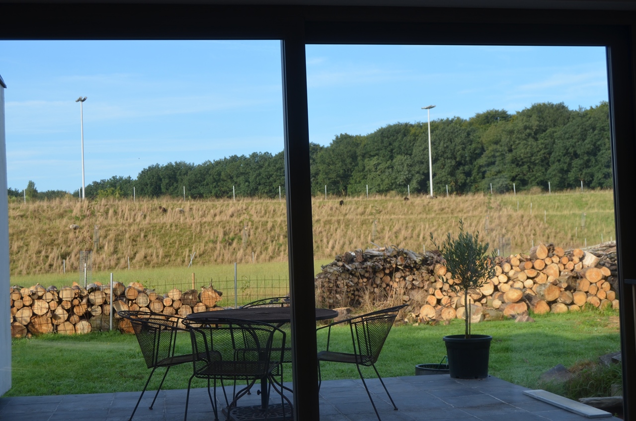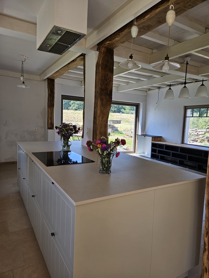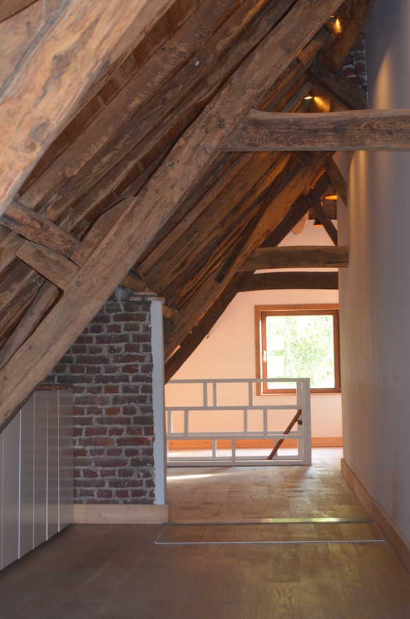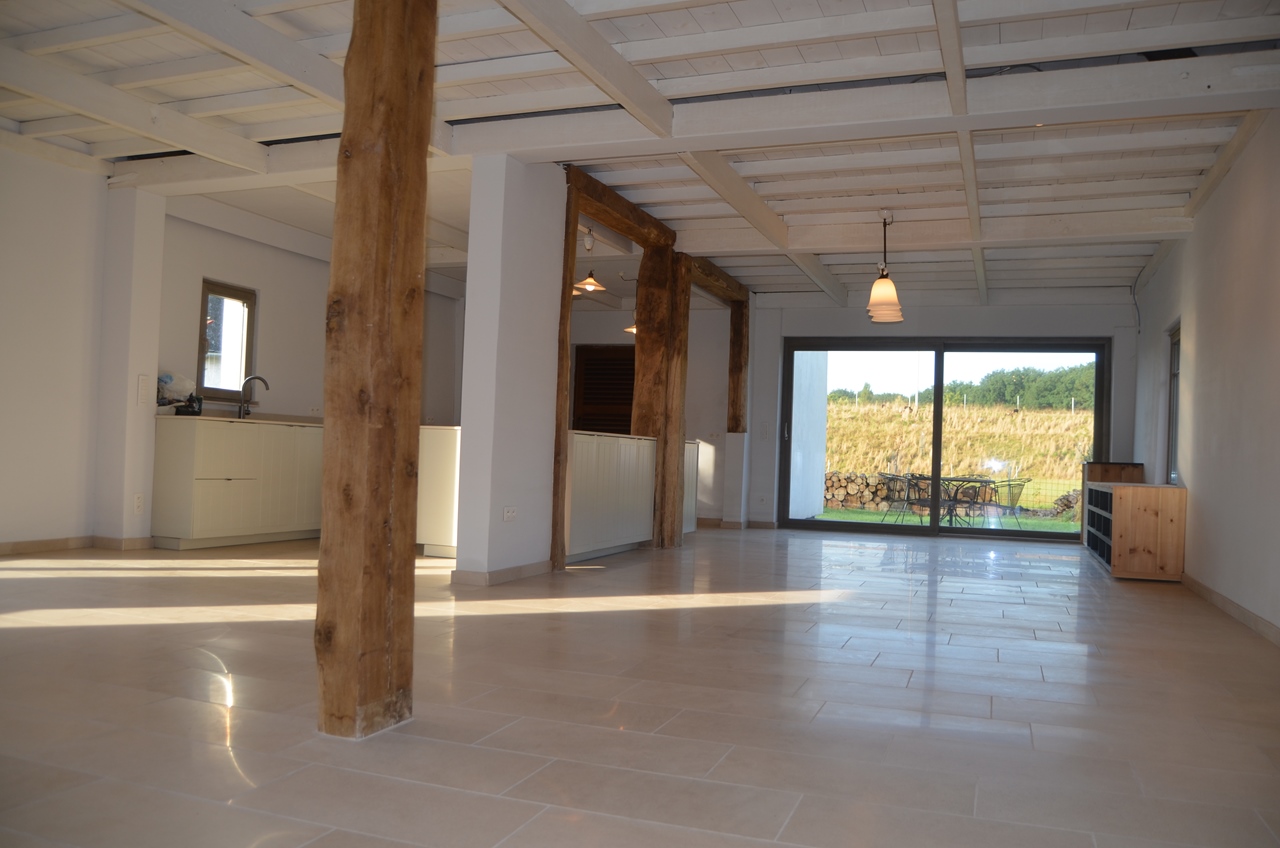 gerenoveerde alleenstaande hoeve met veel licht en hout, een grote gemeenschappelijke ruimte met een groot open keuken eiland, verschillende lees/game hoekjes, dressing, ruime inkom en 4 kamers. een overdekte hooischuur met grote vuurschaal voor winter/zomer bbq's