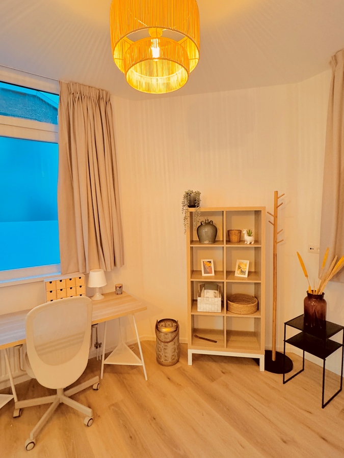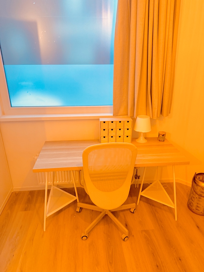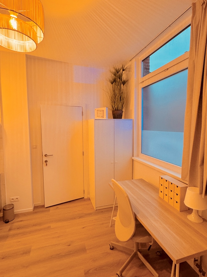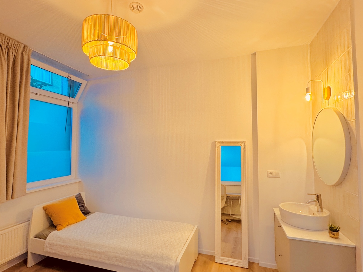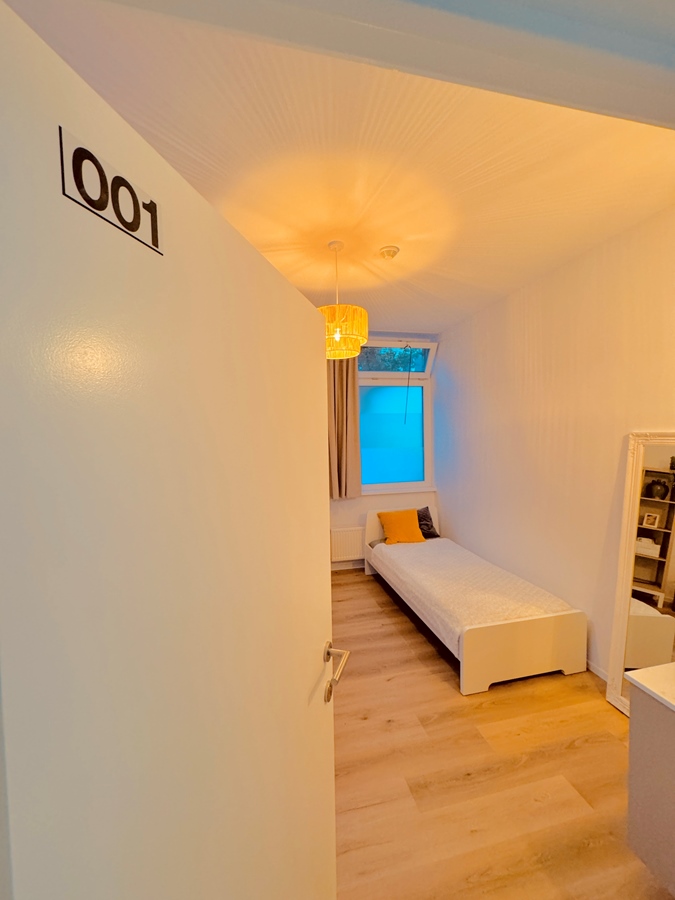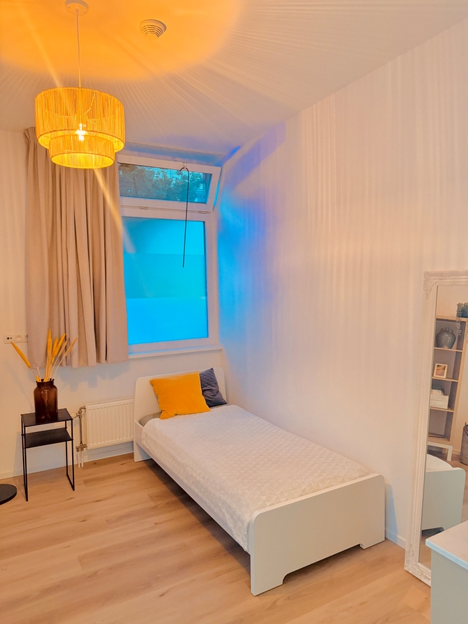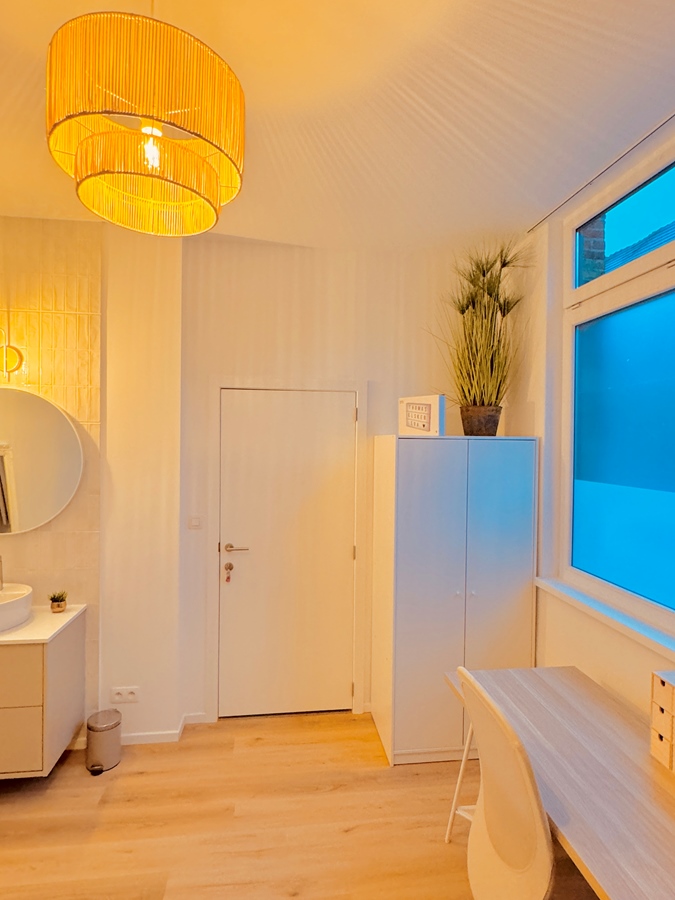 Er zijn veel grote ramen, waardoor het licht naar binnen valt en je kamer een warm gevoel geeft. Uiteraard zijn er ook gordijnen voorzien, deze zijn verduisterend.