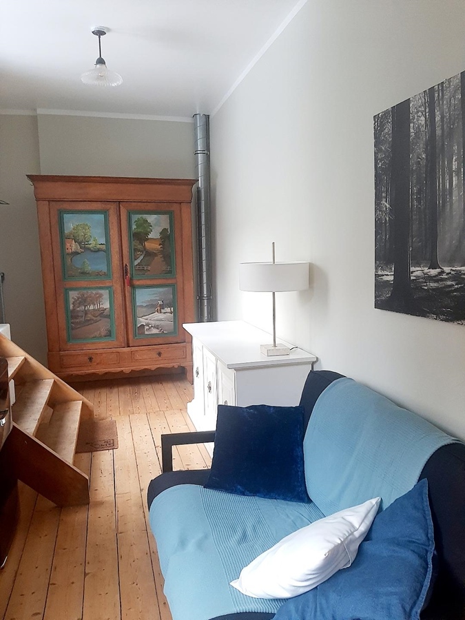 De slaapkamer ligt op de eerste verdieping. Het is er erg rustig en je hebt veel privacy. De kamer geeft uit op het terras en heeft zicht op de tuin. Ze is twee op zes en half meter groot en is bemeubeld met twee legkasten, een zetel, een bed, een tafeltje met stoel en een koelkast. Indien nodig kan er beddengoed worden voorzien.