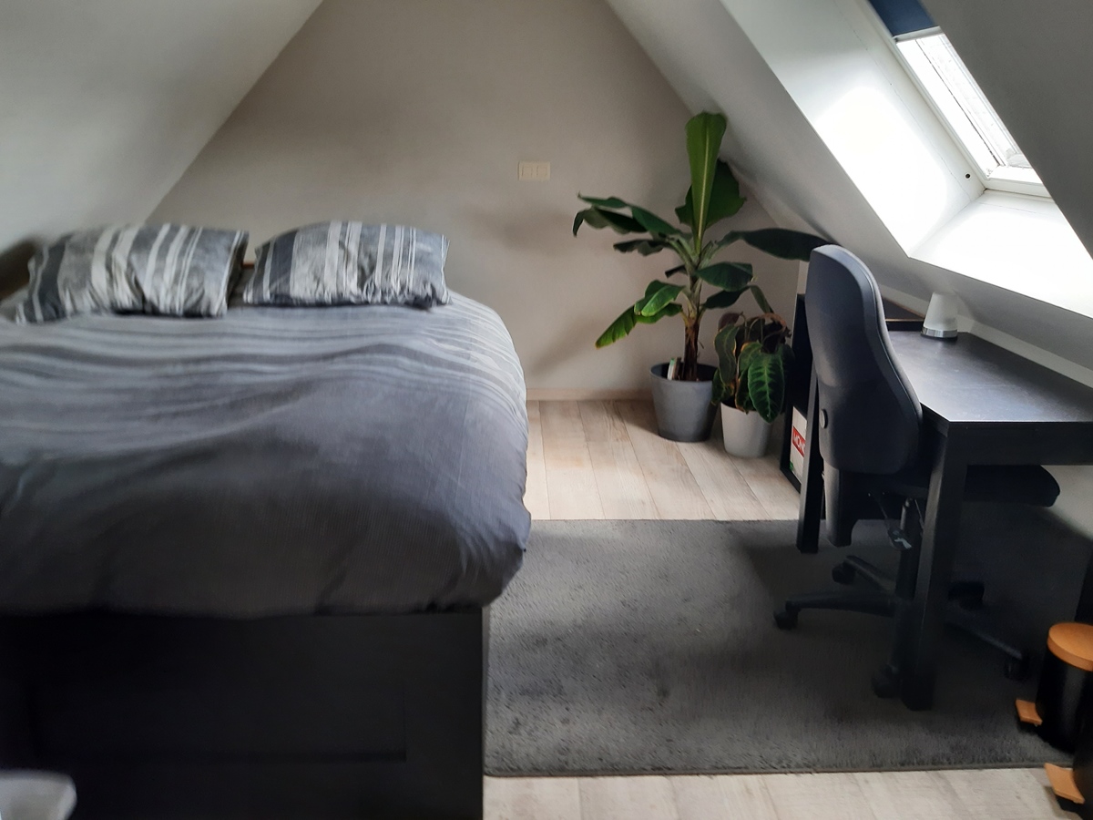 Vanuit het leefgedeelte geeft de trap uit op de privéruimte (alsook de badkamer, niet privé). Deze is voorzien van een tweepersoonsbed, bureau, opbergruimte, en velux.