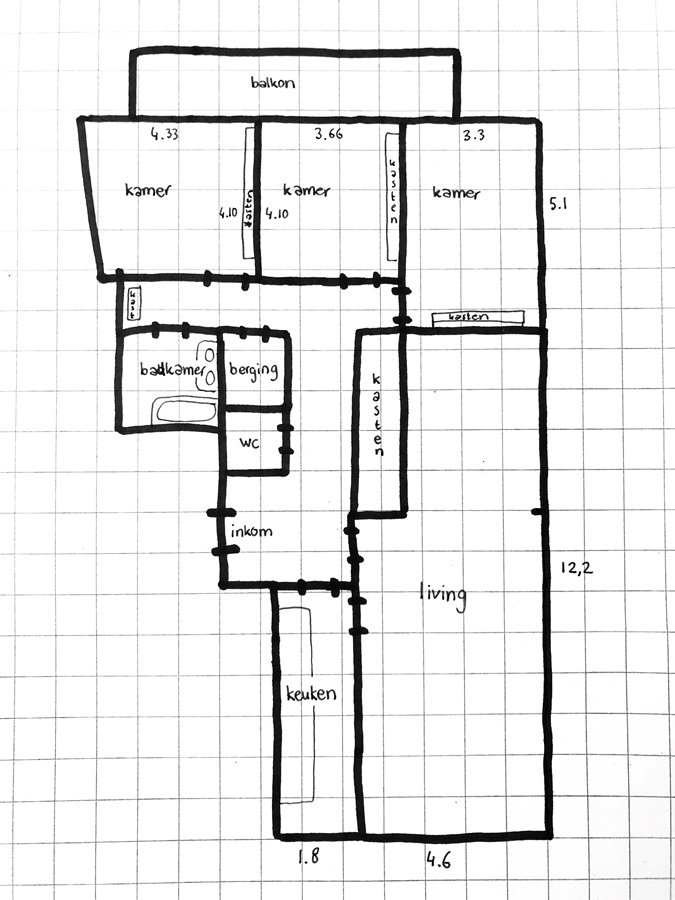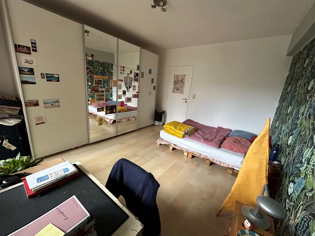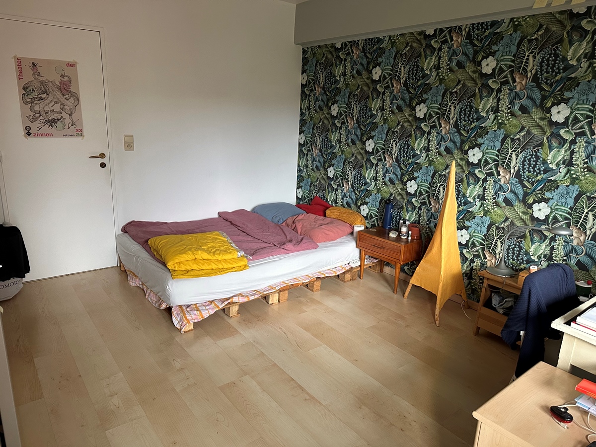 De kamers hebben allebei veel lichtinval en zijn ongeveer 15 en 17 m2. De kamers zijn onbemeubeld (met uitzondering van de grote kledingkast in beide kamers met spiegeldeuren). Er hangt in een van de twee kamers nu zoals je op de foto’s ziet een plantenbehang, eventueel is dat over te schilderen. De ene kamer heeft een deur naar het terras, de andere niet maar daar kan je (veilig) met een trappetje door het raam.