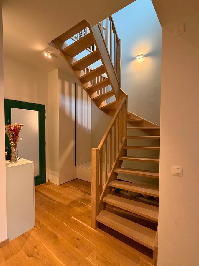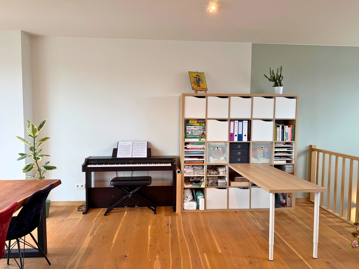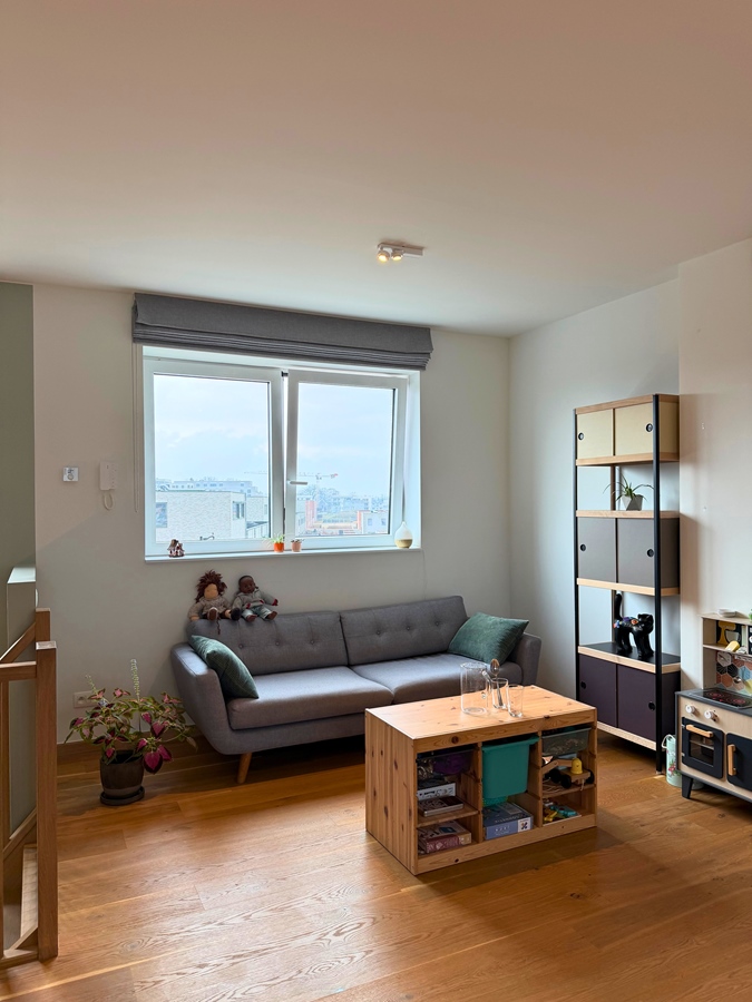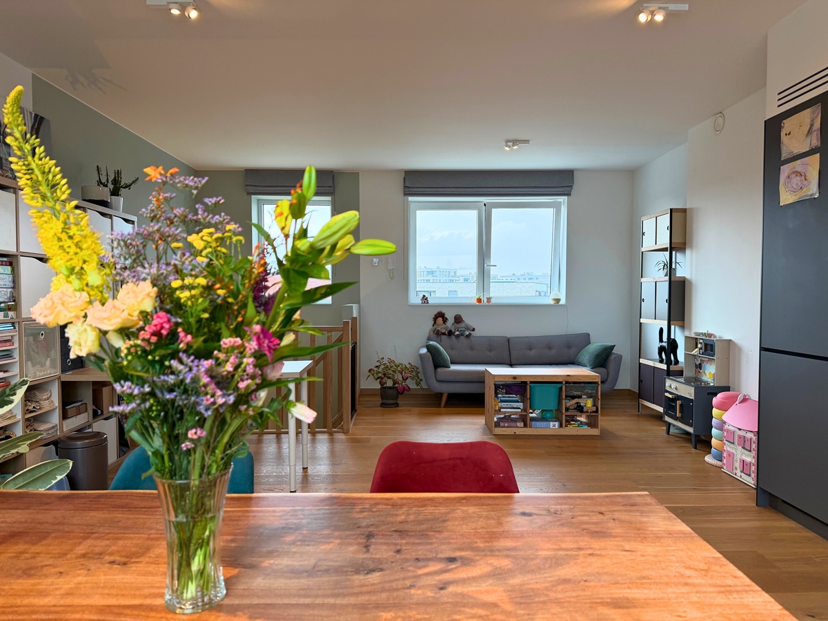 Dit gezellige duplexappartement op de eerste en tweede verdieping biedt 95 m² bewoonbare oppervlakte en 20 m² zonnig terras en staat garant voor ruimte en comfort. De leefruimte bevindt zich bovenaan en geniet dankzij ramen aan beide zijden van een overvloed aan natuurlijk licht.