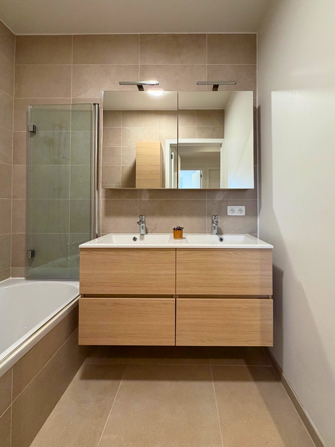 De badkamer is voorzien van een dubbele wastafel, 4 schuiven eronder, een spiegelkast, een bad met glazen douchescherm en een kolomkast.