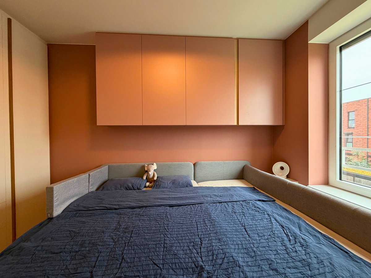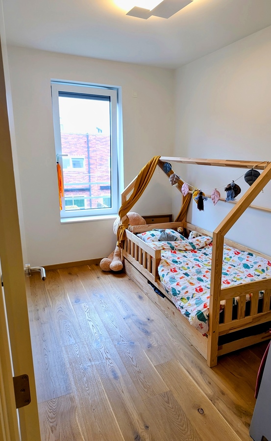 De master bedroom is afgewerkt met inbouwkasten van HUS Interieur. De tweede slaapkamer van 8 m2 wordt momenteel gebruikt als kinderkamer.