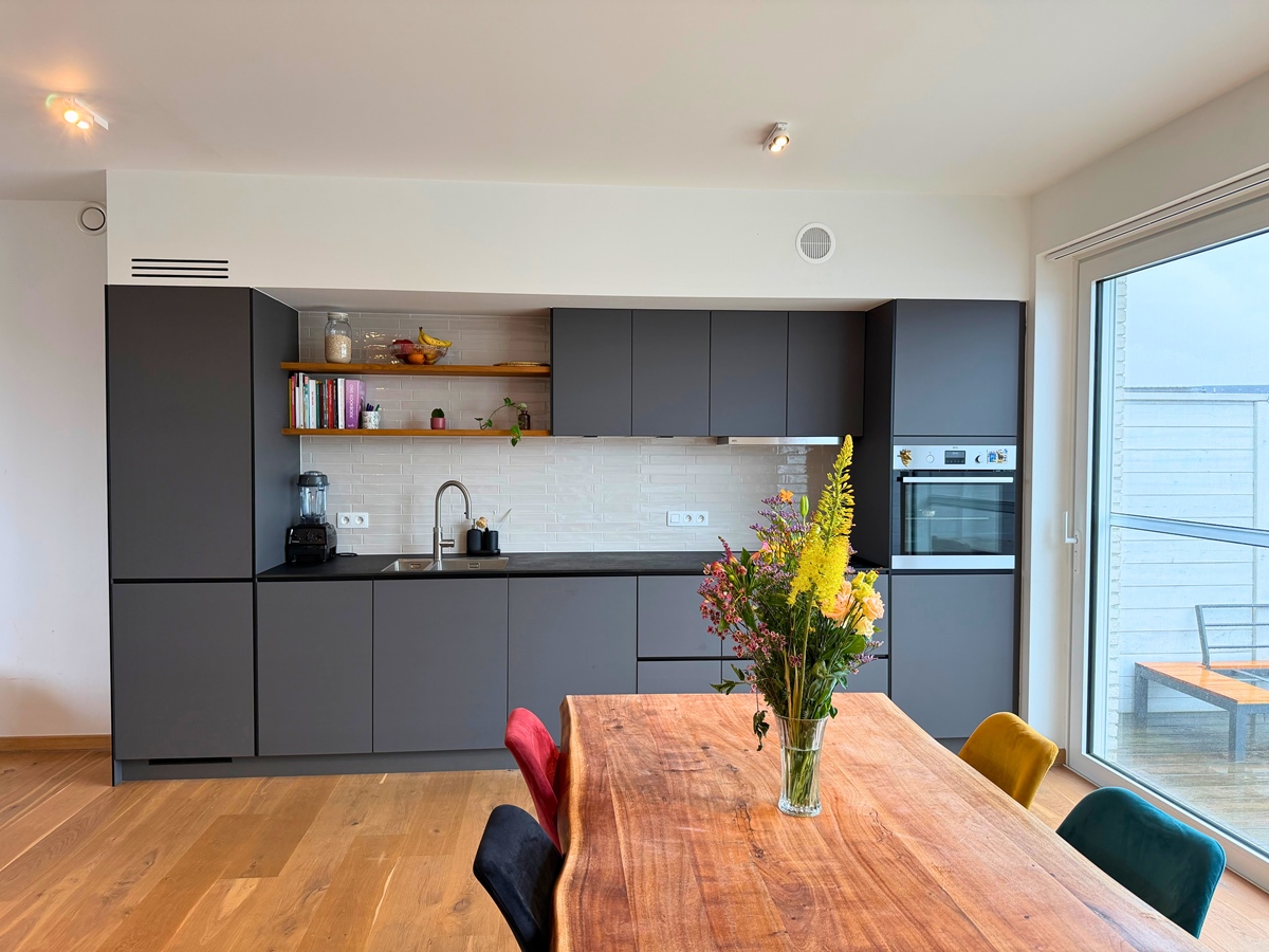 opslagruimte en werkvlak vergeleken met een standaardkeuken. Doordat er veel lades gebruikt zijn, kan je ook makkelijk aan de producten die achteraan in de kast zitten. De toestellen zijn allemaal van AEG: koelkast, diepvriezer, afwasmachine, oven met pyrolysefunctie, keramisch vuur en dampkap. Als extra luxe-element heb je een Quooker kraan waardoor kokend water instantaan uit je kraan stroomt.