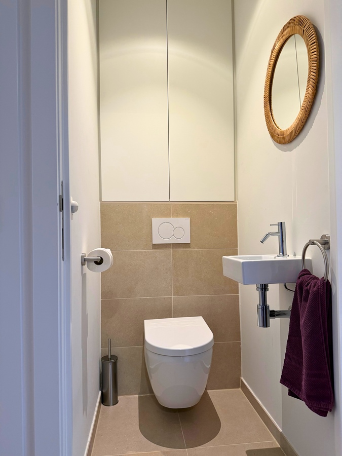 Je komt binnen in het duplex-appartement via de groene voordeur. In de inkomhal vind je inbouwkasten van HUS die veel praktische opbergruimte bieden terwijl tegelijkertijd het open gevoel behouden blijft. Op deze verdieping vind je verder nog 2 slaapkamers, badkamer, toilet en berging.