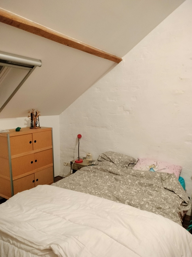 Op het gelijkvloers heb je de keuken en living, op de 1ste verdieping badkamer (met recente inloopdouche), en een bureau/slaapkamer, op de zolder heb je een wasruimte met wasmachine en nog een slaapkamer.