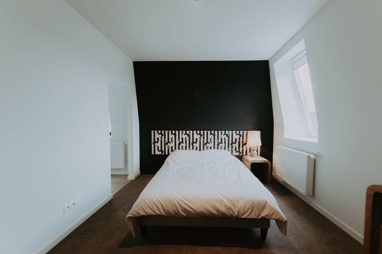 Smaakvol ingerichte slaapkamer met een bed van 140 cm, een bureau, een bedlamp en een kleedkamer. Eigen badkamer grenzend aan de slaapkamer.