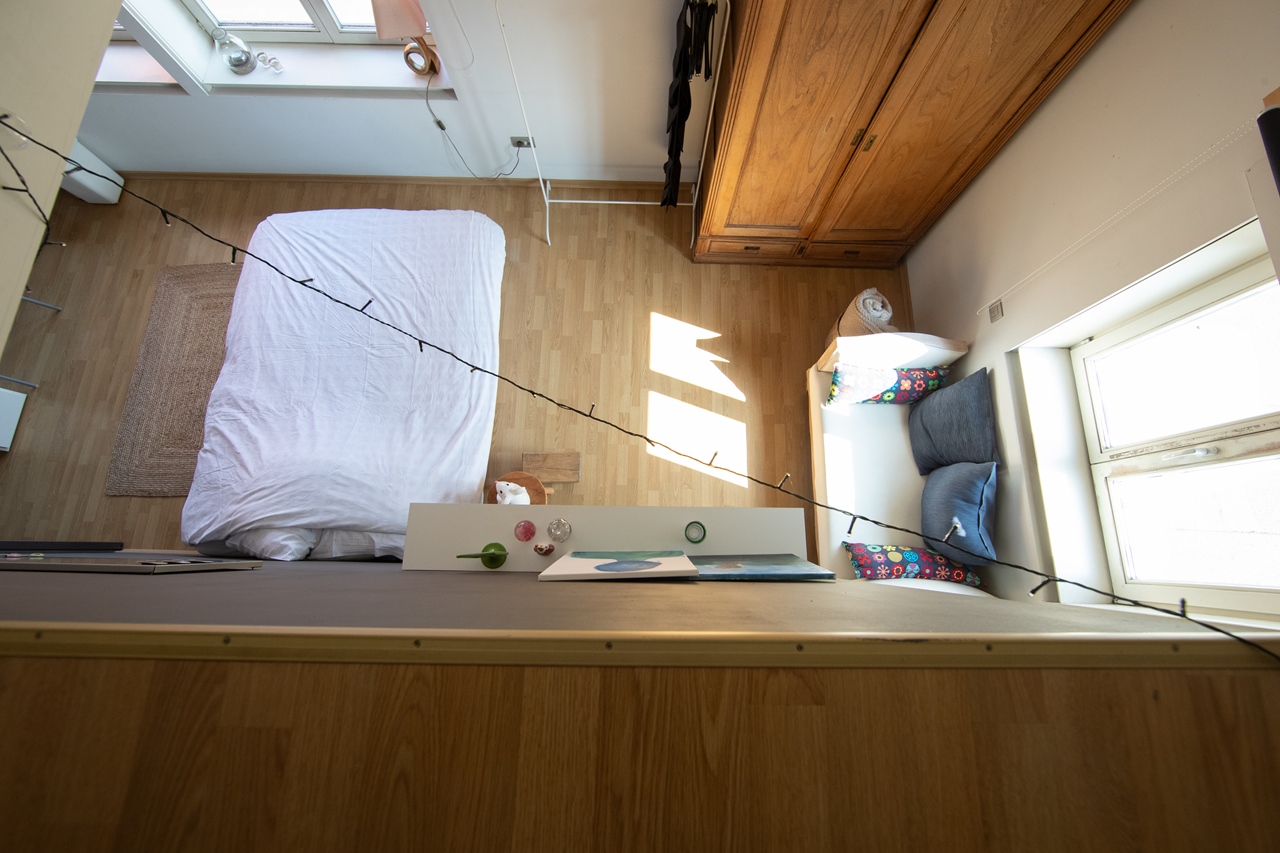 Bureau , kast , Tweepersoons bed, tv en zetel.