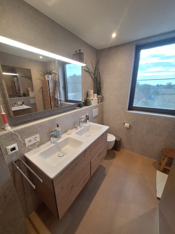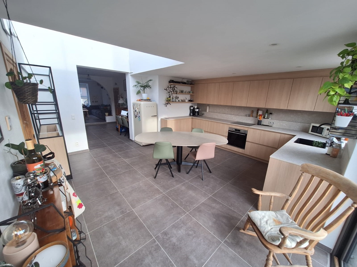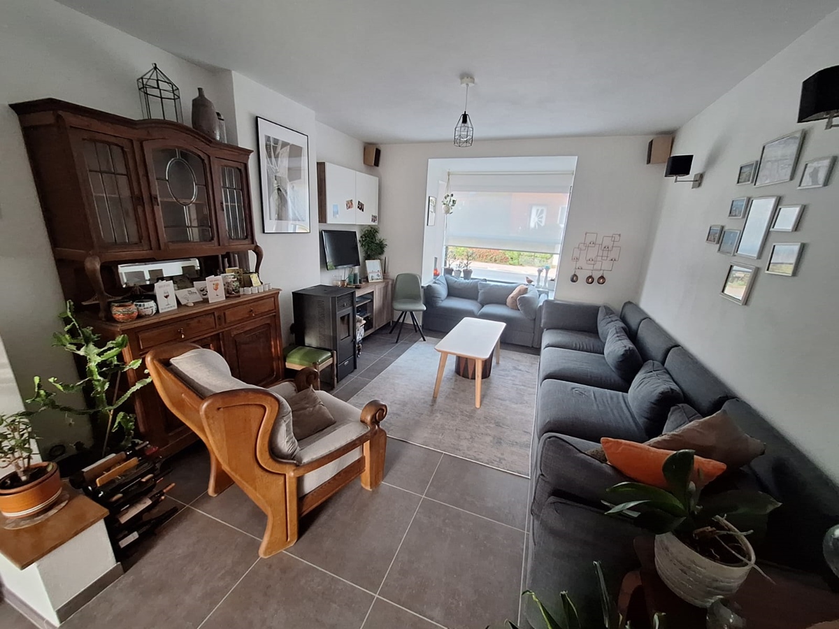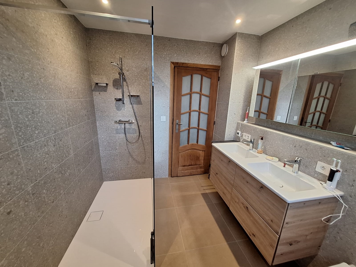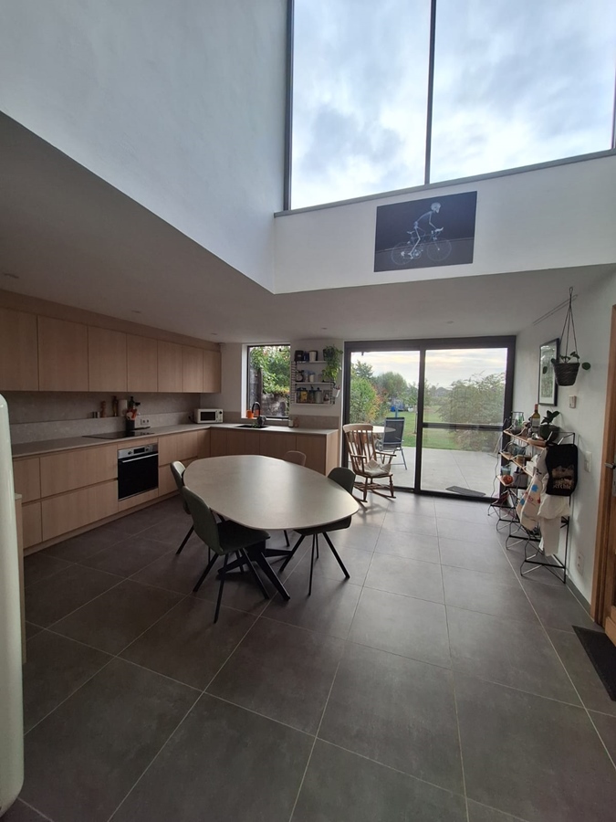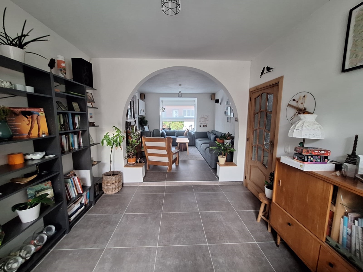Gelijkvloers met inkomhal, woonkamer, keuken, eetruimte, living, toilet, tuin en garage. Boven bevinden zich drie slaapkamers, een badkamer en een TV-ruimte.
