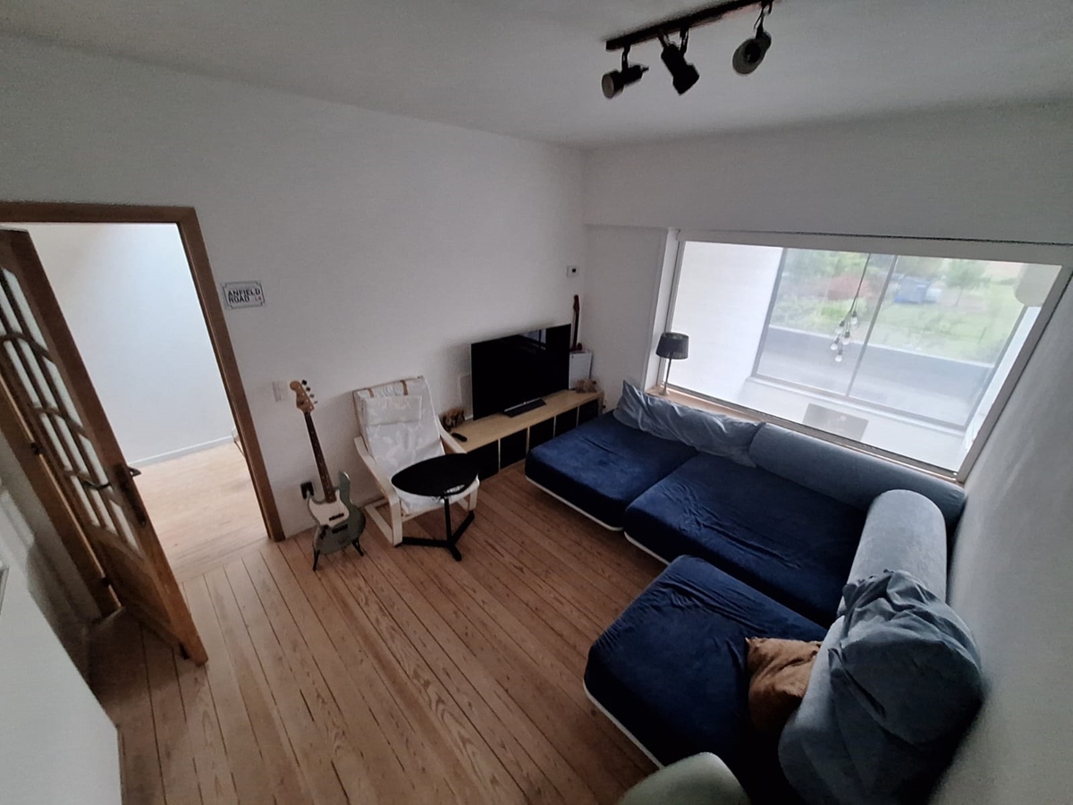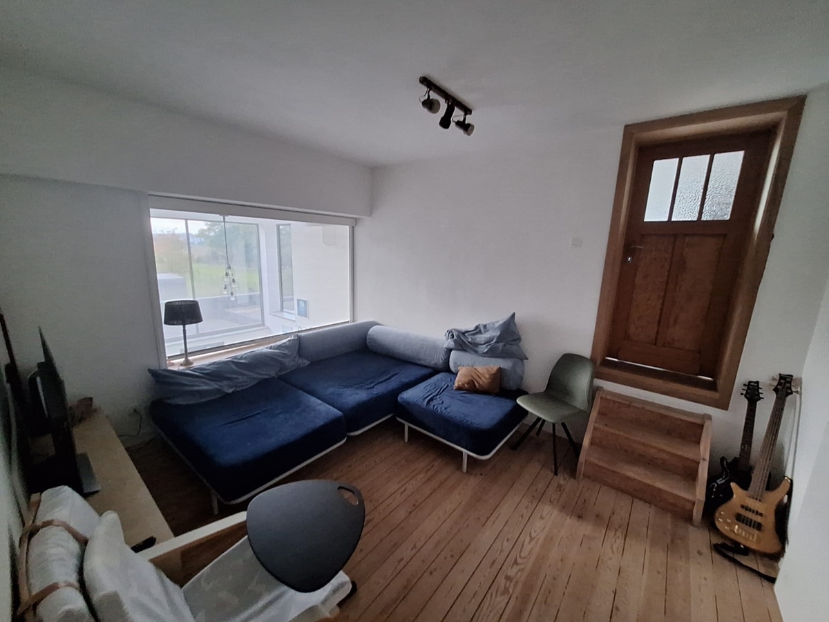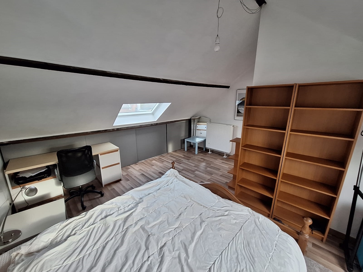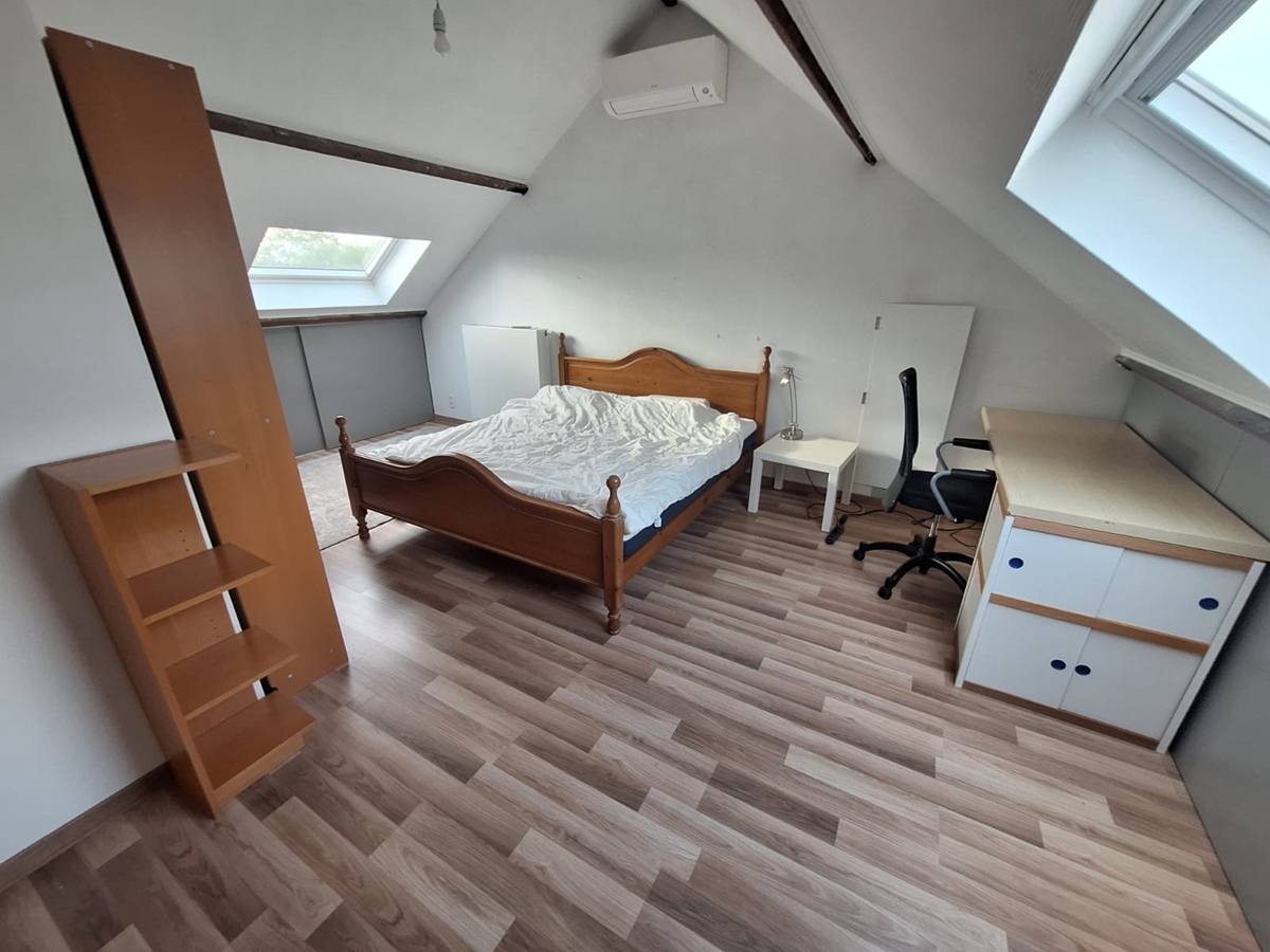 Ruime kamer met twee grote Velux-ramen en een airco. De kamer is bemeubeld.