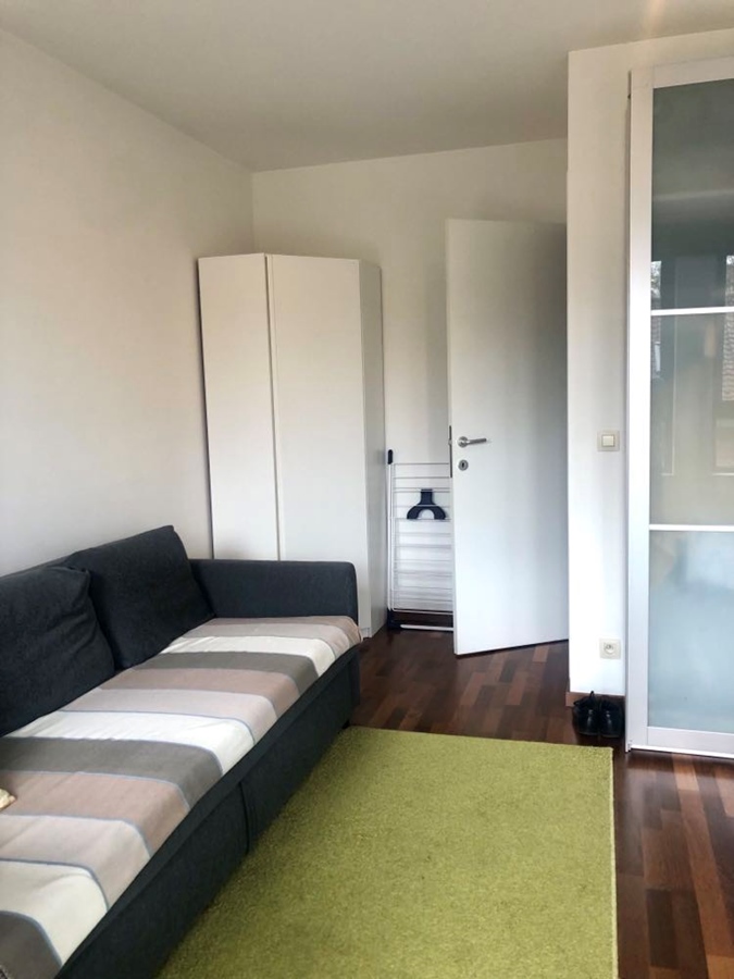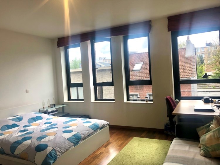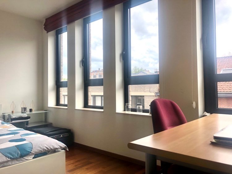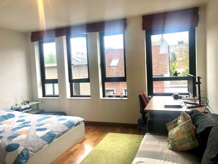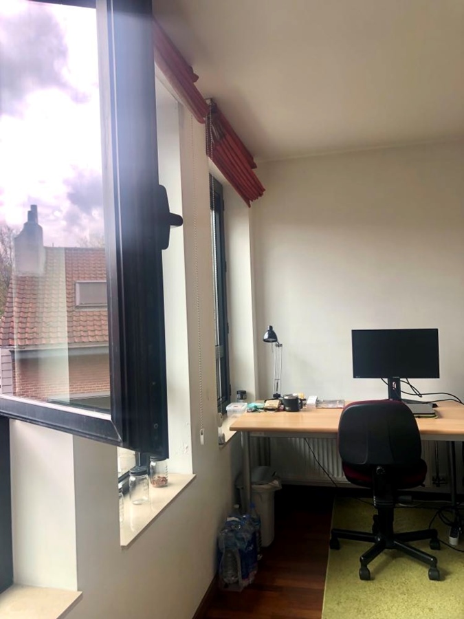 De kamer meet 25m2, alle meubilair is aanwezig: tweepersoonsbed, erg ruime en praktische kleerkast, eigen bureau, bureaustoel, grote zetel met kussens, tapijt, .... Indien gewenst kunnen we iets kleins verwijderen en in de kelder plaatsen, behalve bed, kleerkast en de grote zetel. Er is parket over de gehele kamer en deze geeft uit op onze rustige eenrichtingsstraat. Mooie, ruime lichtinval - wel 4 ramen - en zonnig. Er is amper vis-à-vis (het huis van onze overburen, die met weinig zijn, houdt de ramen altijd geblindeerd). Er is overal sterke, onbeperkte wifi in het huis.