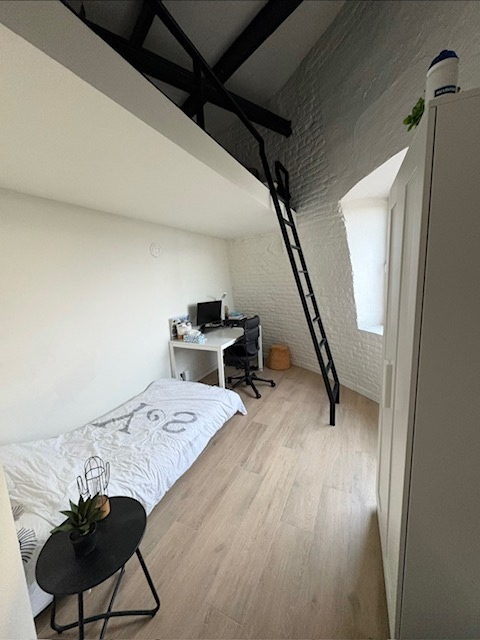 Het gaat over een kamer op de bovenste verdieping (tuinkant) met mezzanine. Huurprijs is 480 € excl kosten. De kamer is bemeubeld met een bed, bureau en kast.