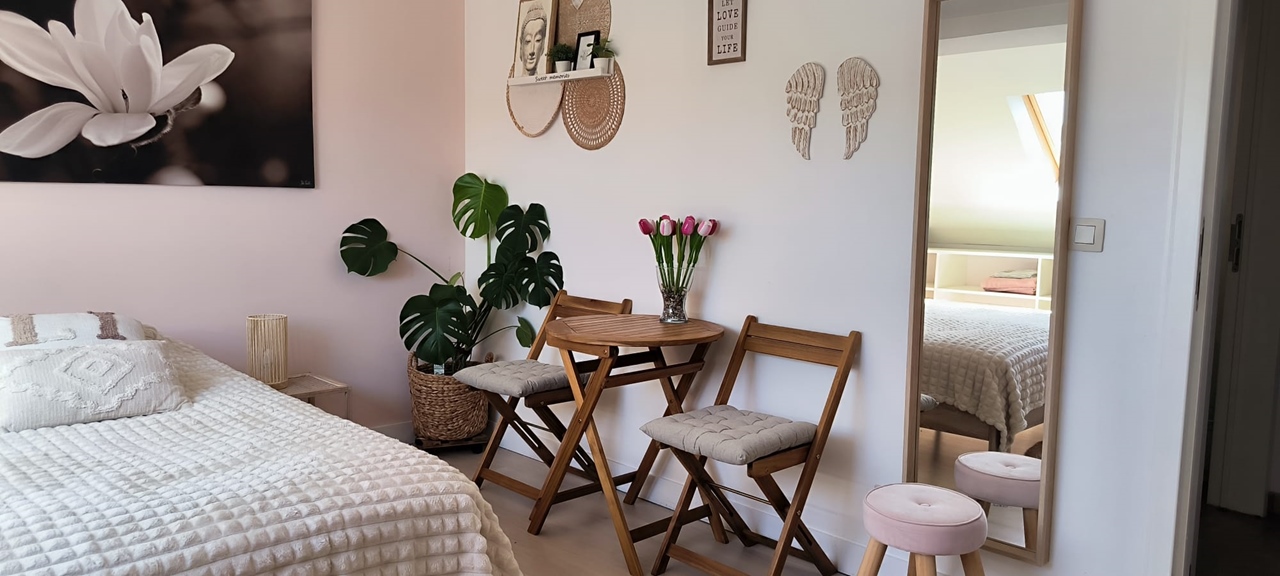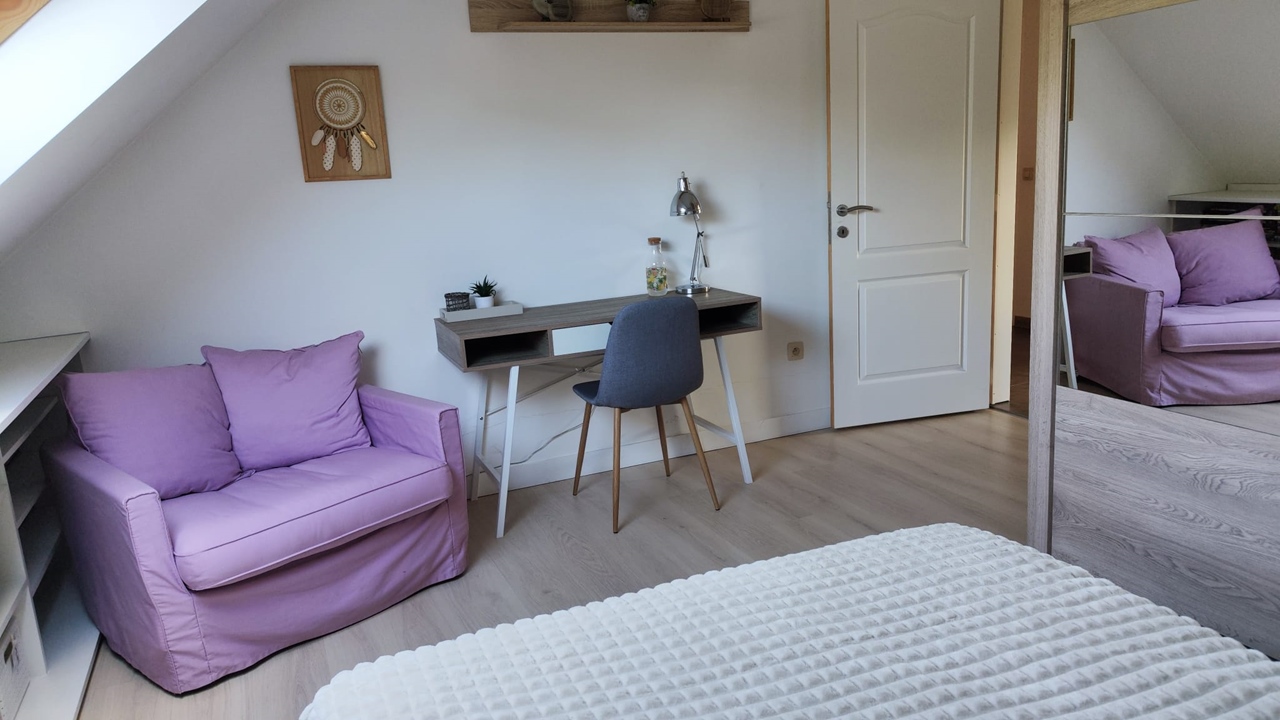 De accommodatie is een ruime, lichte duplexwoning van 240 m², gelegen op de bovenverdieping van een halfvrijstaande woning in een groene en rustige omgeving in Oisquercq (Waals-Brabant), op de grens met Ittre.