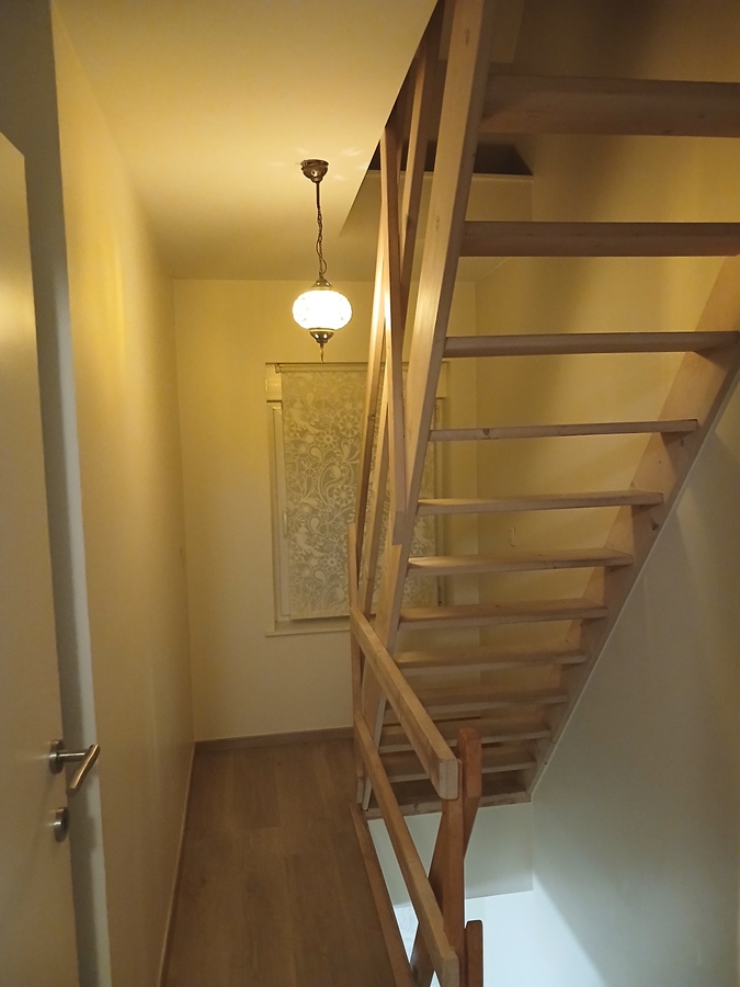 Dan helemaal bovenaan bevindt zich de grootste slaapkamer onder de nok van het dak, gezellig metdat de eiken balken zichtbaar zijn, ook voldoende bergruimte aanwezig