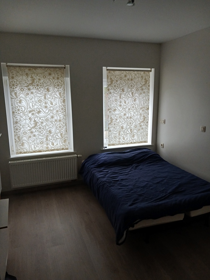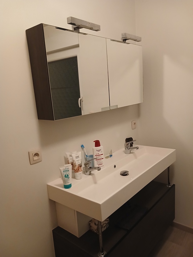 1ste verdiepingen bevat ruime slaapkamer, daarnaast bevindt zich de badkamer met twee lavabo's en douchecabine.